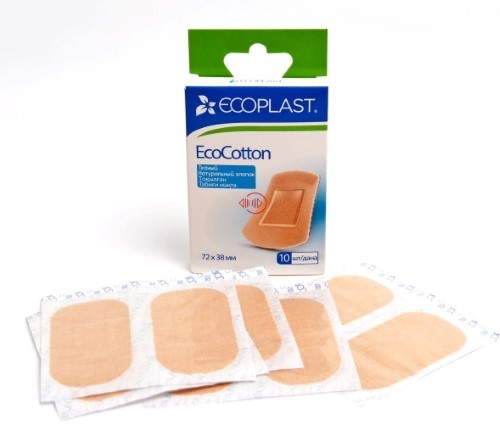 Набор EcoCotton mini состоит из 10 телесных пластырей прямоугольной формы размера 72х38 мм.