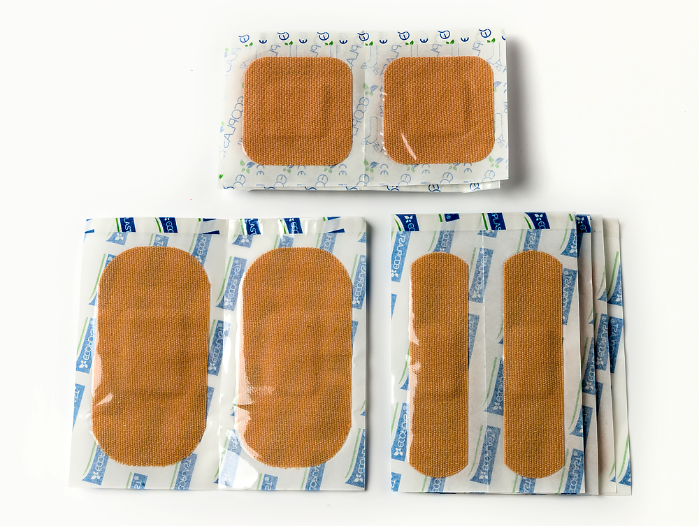 Пластырь из эластичной ткани с подушечкой из натурального хлопка, ламинированной полиэтиленовой перфорированной плёнкой, в индивидуальной упаковке состоящей из принтованой бумаги и прозрачной пленки.