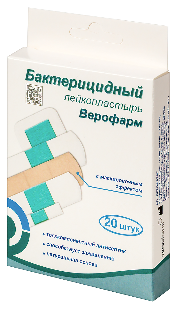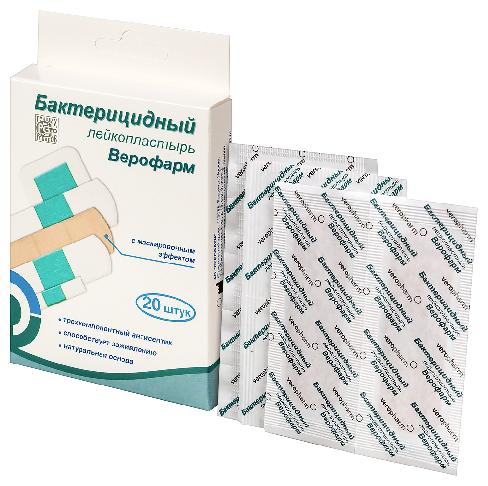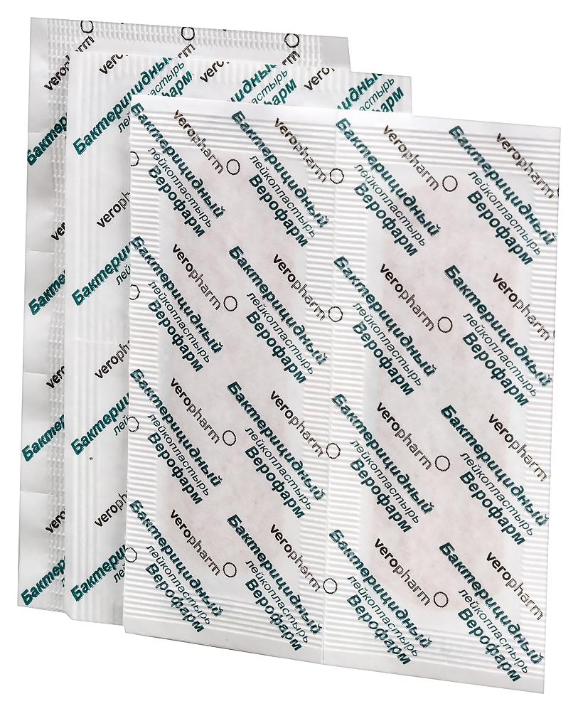 Бактерицидный лейкопластырь Верофарм представляет собой ленту Лейкопластыря Верофарм фиксирующий» с подушечкой зеленого цвета из нетканого материала, пропитанного раствором антисептиков, покрытую с липкой стороны защитным покрытием.