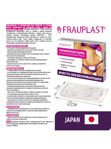 Термопластырь от менструальной боли FRAUPLAST на нетканой основе предназначен для уменьшения боли в первые дни менструального цикла. Благодаря входящим в состав пластыря ингредиентам выделяемое тепло (в течение 6 часов) снимает спазм мышц и оказывает согревающее и успокаивающее действие. Средняя температура нагрева ФРАУПЛАСТ - 50'С (максимальная температура 68'С) достигается в течение 15-20 минут.