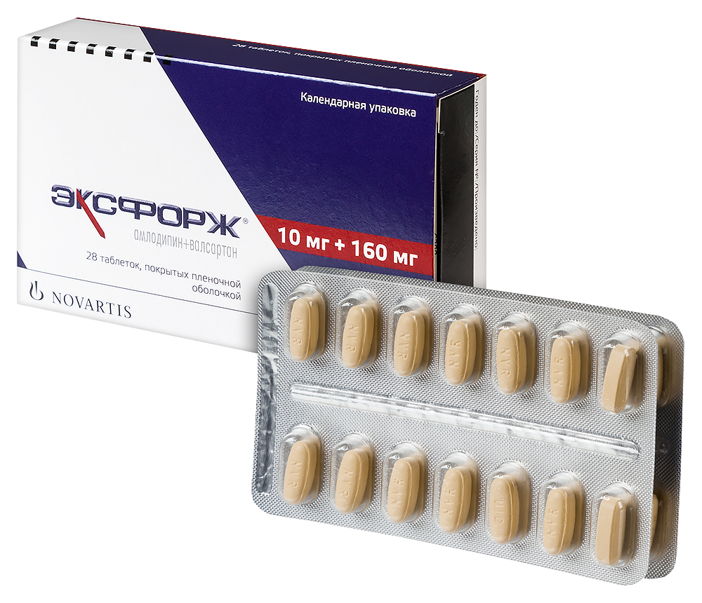 - Способ применения и дозыПрепарат следует принимать внутрь, запивая небольшим количеством воды, 1 раз в сутки независимо от времени приема пищи. Рекомендуемая суточная доза - 1 таблетка, содержащая амлодипин+валсартан в дозе 5 мг+80 мг, или 5 мг+160 мг, или 10 мг+160 мг (максимальная суточная доза по амлодипину). Пациент, получающий валсартан и амлодипин в разных таблетках/капсулах, может быть переведен на прием препарата Эксфорж® в таблетках, содержащих ту же дозировку действующих веществ. У пациентов, которым может потребоваться многокомпонентная медикаментозная терапия для достижения целевых значений АД, лечение может быть начато с препарата Эксфорж®. Следует тщательно оценить отношение польза/риск при выборе препарата Эксфорж® в качестве начальной терапии АГ. Начинать прием препарата рекомендовано с дозы 5 мг+80 мг 1 раз в сутки. Увеличивать дозу можно через 1-2 недели после начала терапии. Максимальная доза амлодипина и валсартана составляет 10 мг+320 мг в сутки. Таблетки неделимые и не могут быть разделены на равные дозы. Пациенты с нарушением функции почек Для пациентов с нарушениями функции почек легкой и средней степени тяжести (СКФ ≥30 мл/мин/1,73 м2) коррекции начальной дозы не требуется. Пациенты с нарушением функции печени Вследствие наличия в составе валсартана и амлодипина препарат Эксфорж® следует с осторожностью применять у пациентов с нарушениями функции печени и обструктивными заболеваниями желчевыводящих путей. У пациентов данной категории следует рассмотреть возможность применения начальной дозы препарата, содержащей наименьшую дозу амлодипина, т.е. одна таблетка, содержащая амлодипин+валсартан в дозе 5 мг+80 мг или 5 мг+160 мг. Применение у пациентов старше 65 лет Поскольку оба компонента препарата одинаково хорошо переносятся при применении в соответствующих дозах у пожилых пациентов (в возрасте 65 лет и старше) или у пациентов младше данной возрастной категории, не требуется коррекции начальной дозы препарата у данных пациентов. Следует рассмотреть возможность применения начальной дозы препарата, содержащей наименьшую дозу амлодипина, т.е. одна таблетка, содержащая амлодипин+валсартан в дозе 5 мг+80 мг или 5 мг+160 мг. Применение у детей и подростков в возрасте до 18 лет Поскольку данных о безопасности и эффективности препарата Эксфорж® у детей и подростков (младше 18 лет) недостаточно, препарат не рекомендуется применять у пациентов данной категории.