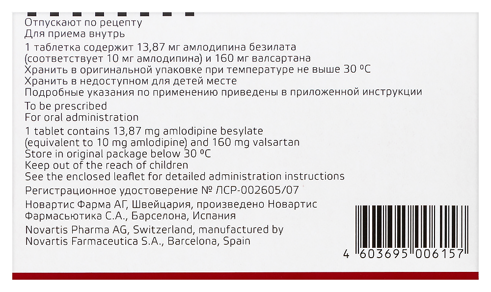 - Состав1 таблетка, покрытая пленочной оболочкой, содержит: действующие вещества: амлодипина безилат - 13,87 мг (соответствует 10,00 мг амлодипина соответственно), валсартан - 160,00 мг; вспомогательные вещества: целлюлоза микрокристаллическая, кросповидон, магния стеарат, кремния диоксид коллоидный; оболочка пленочная: Premix белая (гипромеллоза, титана диоксид (Е 171), макрогол 4000, тальк); Premix желтая (гипромеллоза, краситель железа оксид желтый (Е 172), макрогол 4000, тальк); Premix красная (гипромеллоза, краситель железа оксид красный (Е 172), макрогол 4000, тальк).