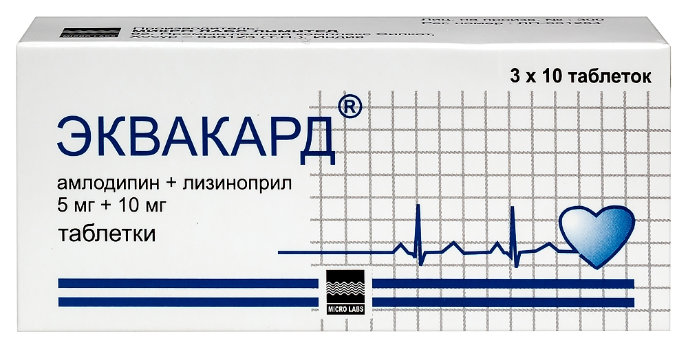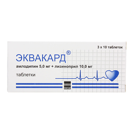 - Способ применения и дозыТаблетки препарата Эквакард® принимают внутрь один раз в сутки независимо от времени приема пищи, запивая достаточным количеством жидкости. Доза препарата Эквакард® подбирается после ранее проведенного титрования доз отдельных компонентов. Рекомендуемая начальная доза препарата Эквакард® составляет 5 мг амлодипина + 5 мг лизиноприла или 5 мг амлодипина + 10 мг лизиноприла 1 раз в сутки. В начале терапии препаратом Эквакард® может развиться симптоматическая артериальная гипотензия, которая чаще возникает у пациентов с нарушениями водно-электролитного баланса вследствие предшествующей терапии диуретиками. Прием диуретиков должен быть прекращен за 2-3 дня до начала терапии препаратом Эквакард®. В случаях, когда отмена диуретиков невозможна, начальная доза препарата Эквакард составляет 1/2 таблетки (содержащая 5 мг амлодипина +5 мг лизиноприла) 1 раз в сутки, после приёма которой, в течение нескольких часов следует обеспечить наблюдение за пациентом из-за возможного развития симптоматической артериальной гипотензии. Максимальная суточная доза препарата Эквакард® составляет 1/2 таблетки (5 мг амлодипина + 5 мг лизиноприла или 5 мг амлодипина + 10 мг лизиноприла) (по амлодипину). Нарушения функции почек У пациентов с нарушением функции почек рекомендуется применять препарат Эквакард® в дозе 5 мг амлодипина + 5 мг лизиноприла (увеличение Т1/2 лизиноприла). Поддерживающая доза подбирается в зависимости от переносимости проводимой терапии, требуется контроль функции почек, содержания калия и натрия в плазме крови. В случае ухудшения функции почек применение препарата Эквакард® необходимо прекратить и заменить его применение на амлодипин и лизиноприл в монотерапии в адекватных дозах. Нарушения функции печени Выведение амлодипина может быть замедлено у пациентов с нарушениями функции печени. У пациентов с нарушениями функции печени рекомендуется применять препарат Эквакард® в дозе 5 мг амлодипина + 5 мг лизиноприла (увеличение Т1/2 амлодипина). Применение у пожилых пациентов В клинических исследованиях эффективности и безопасности амлодипина или лизиноприла у пациентов пожилого возраста изменений не выявлено. Для определения оптимальной поддерживающей дозы необходимо определять режим дозирования в индивидуальном порядке, применяя амлодипин и лизиноприл в монотерапии.