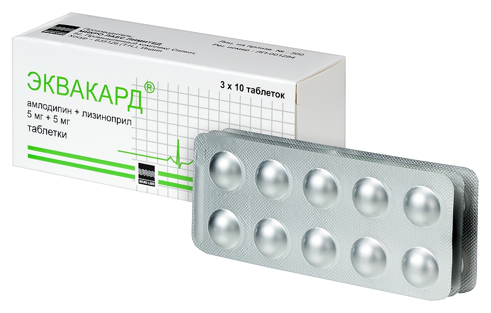 - Способ применения и дозыТаблетки препарата Эквакард® принимают внутрь один раз в сутки независимо от времени приема пищи, запивая достаточным количеством жидкости. Доза препарата Эквакард® подбирается после ранее проведенного титрования доз отдельных компонентов. Рекомендуемая начальная доза препарата Эквакард® составляет 5 мг амлодипина + 5 мг лизиноприла или 5 мг амлодипина + 10 мг лизиноприла 1 раз в сутки. В начале терапии препаратом Эквакард® может развиться симптоматическая артериальная гипотензия, которая чаще возникает у пациентов с нарушениями водно-электролитного баланса вследствие предшествующей терапии диуретиками. Прием диуретиков должен быть прекращен за 2-3 дня до начала терапии препаратом Эквакард®. В случаях, когда отмена диуретиков невозможна, начальная доза препарата Эквакард составляет 1/2 таблетки (содержащая 5 мг амлодипина +5 мг лизиноприла) 1 раз в сутки, после приёма которой, в течение нескольких часов следует обеспечить наблюдение за пациентом из-за возможного развития симптоматической артериальной гипотензии. Максимальная суточная доза препарата Эквакард® составляет 1/2 таблетки (5 мг амлодипина + 5 мг лизиноприла или 5 мг амлодипина + 10 мг лизиноприла) (по амлодипину). Нарушения функции почек У пациентов с нарушением функции почек рекомендуется применять препарат Эквакард® в дозе 5 мг амлодипина + 5 мг лизиноприла (увеличение Т1/2 лизиноприла). Поддерживающая доза подбирается в зависимости от переносимости проводимой терапии, требуется контроль функции почек, содержания калия и натрия в плазме крови. В случае ухудшения функции почек применение препарата Эквакард® необходимо прекратить и заменить его применение на амлодипин и лизиноприл в монотерапии в адекватных дозах. Нарушения функции печени Выведение амлодипина может быть замедлено у пациентов с нарушениями функции печени. У пациентов с нарушениями функции печени рекомендуется применять препарат Эквакард® в дозе 5 мг амлодипина + 5 мг лизиноприла (увеличение Т1/2 амлодипина). Применение у пожилых пациентов В клинических исследованиях эффективности и безопасности амлодипина или лизиноприла у пациентов пожилого возраста изменений не выявлено. Для определения оптимальной поддерживающей дозы необходимо определять режим дозирования в индивидуальном порядке, применяя амлодипин и лизиноприл в монотерапии.