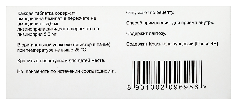 - СоставСостав на одну таблетку: 5 мг+5 мг: действующие вещества: амлодипина безилат (в пересчете на амлодипин) 5, 000 мг; лизиноприла дигидрат в пересчете на лизиноприл 5,000 мг вспомогательные вещества: лактоза 106,340 мг; крахмал кукурузный 58,860 мг; повидон К30 5,700 мг; тальк 3,860 мг; магния стеарат 1,950 мг; краситель пунцовый [Понсо 4R] 0,100 мг