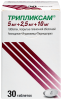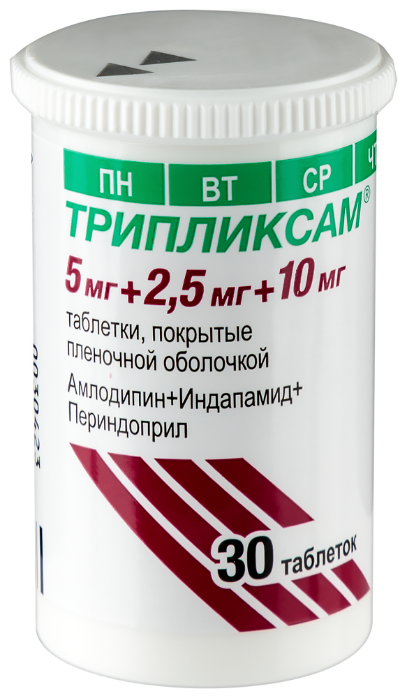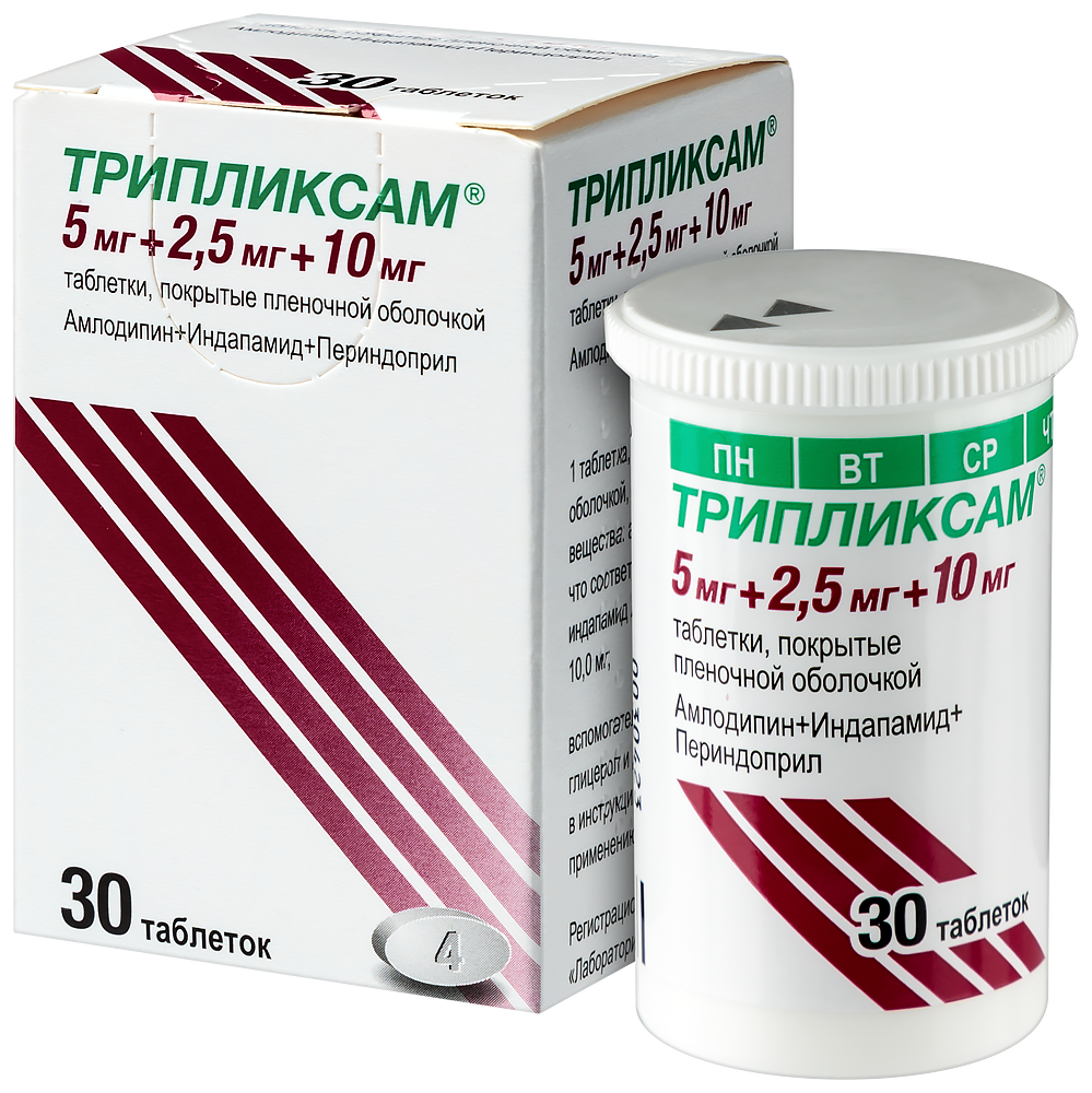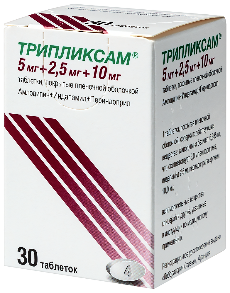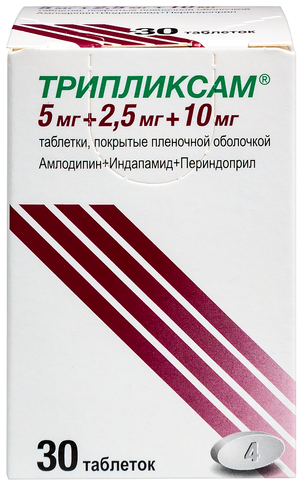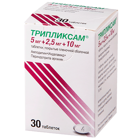 - Способ применения и дозыВнутрь, по 1 таблетке 1 раз в сутки предпочтительно утром перед приемом пищи. Доза препарата Трипликсам® подбирается после ранее проведенного титрования доз отдельных компонентов. Максимальная суточная доза - 1 таблетка в дозировке 10,0 мг + 2,5 мг + 10,0 мг. Особые группы пациентов Пациенты с почечной недостаточностью (см. разделы "Фармакокинетика", "Противопоказания" и "Особые указания") Трипликсам® противопоказан пациентам с тяжелой почечной недостаточностью (КК менее 30 мл/мин) (см. раздел "Противопоказания"). Пациентам с почечной недостаточностью средней тяжести (КК 30-60 мл/мин) Трипликсам® противопоказан в дозировке 5,0 мг + 2,5 мг + 10,0 мг и 10,0 мг + 2,5 мг + 10,0 мг. Рекомендуется начинать терапию с подбора доз монокомпонентов. Постоянное медицинское наблюдение должно включать в себя регулярный контроль концентрации креатинина и калия в плазме крови. Одновременное применение с алискиреном противопоказано у пациентов с нарушениями функции почек (СКФ < 60 мл/мин/1,73 м2 площади поверхности тела) (см. раздел "Противопоказания"). Пациенты с печеночной недостаточностью (см. разделы "Фармакокинетика" "Противопоказания" и "Особые указания") Пациентам с тяжелой печеночной недостаточностью Трипликсам® противопоказан. Для пациентов с легкой или умеренной печеночной недостаточностью подбор дозы необходимо проводить с осторожностью, так как нет однозначных рекомендаций по дозировке амлодипина для данной группы пациентов. Пациенты пожилого возраста (см. раздел "Особые указания") Выведение периндоприлата у пациентов пожилого возраста замедлено (См. раздел "Фармакокинетика"). Терапия должна проводиться с учетом функции почек. Пациенты детского возраста В настоящее время нет данных по безопасности и эффективности применения препарата Трипликсам® у детей и подростков. Свернуть