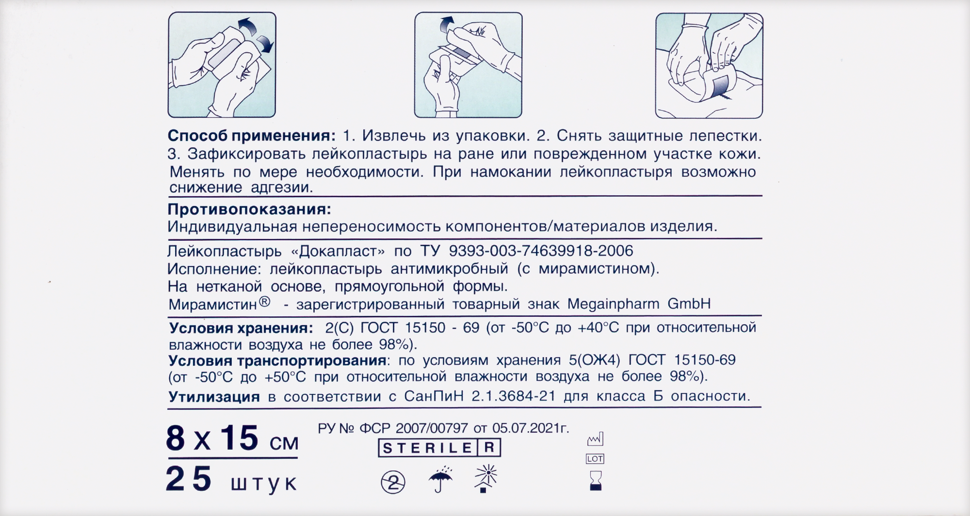 Докапласт® с мирамистином - стерильный антимикробный лейкопластырь на основе мягкого нетканого полотна с не прилипающей к ране сорбционной подушечкой, покрытой атравматической микросеткой и пропитанной мирамистином.