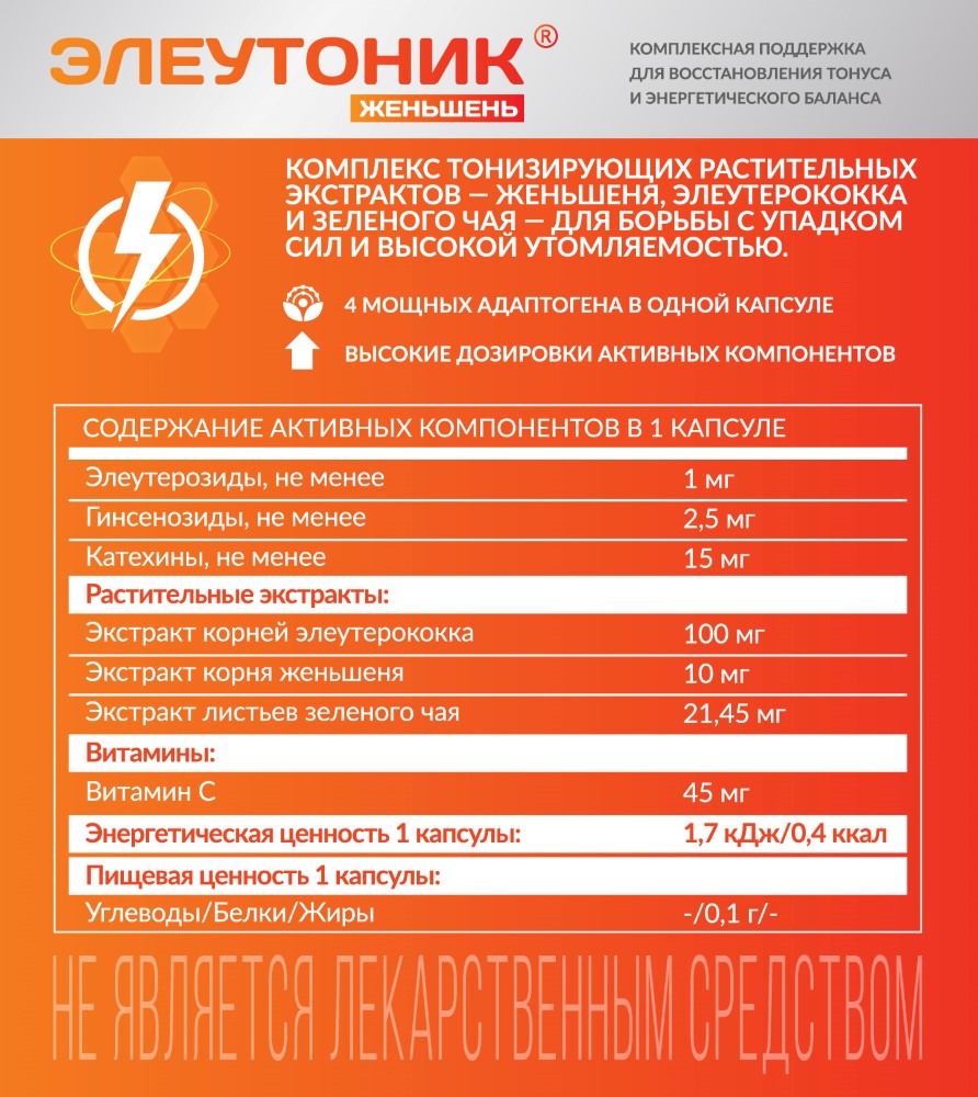 Комплекс «Элеутоник Женьшень» включает в себя экстракты корней элеутерококка, женьшеня и листьев зеленого чая, а также витамин С, оказывающие тонизирующее и адаптогенные свойства.