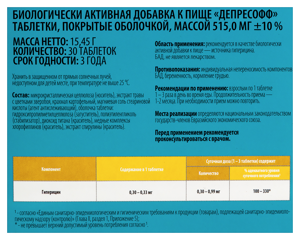 Биологически активная добавка к пище «Депресофф» (таблетки, покрытые оболочкой, массой 515,0 мг ±10 %)