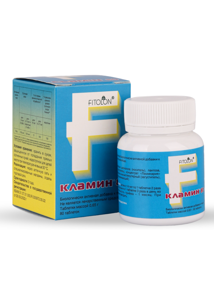 Кламин® 80 является средством для борьбы с дефицитом йода. В 1 таблетке Кламин® 80 содержится 50 мкг йода. Прием 2-3 таблеток удовлетворяет суточную потребность в йоде. Кламин® 80 оказывает онкопротективный эффект у пациентов с предраковыми заболеваниями и болезнями, повышающими онкологический риск.