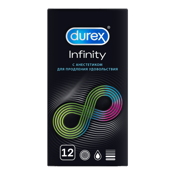 Презервативы Durex Infinity для продления полового акта, а также предотвращения преждевременной эякуляции. Презервативы Durex Infinity содержат смазку с добавлением анестетика (бензокаина) внутри презерватива и обычную силиконовую смазку снаружи. Для продления полового акта, а также предотвращения преждевременной эякуляции. Благодаря технологии производства не имеют неприятного запаха. Все предусмотрено для того, чтобы вы могли расслабиться и наслаждаться безопасным сексом.