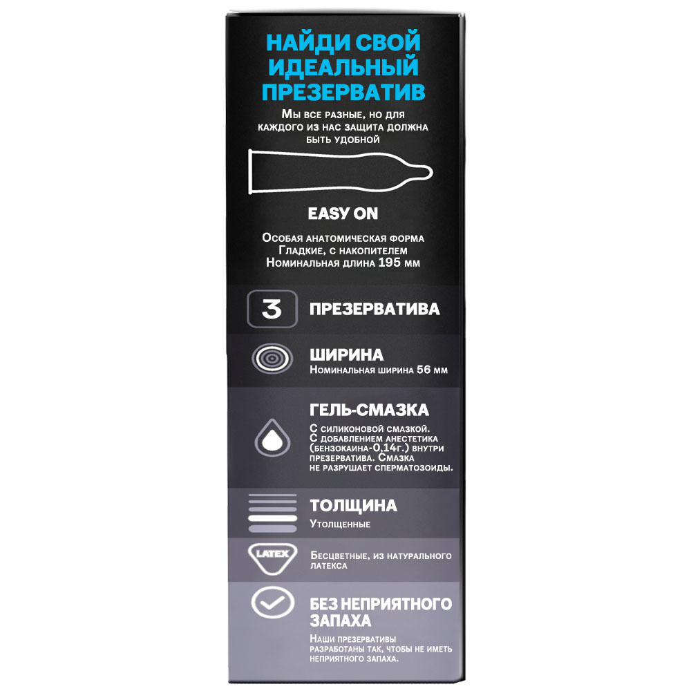 Презервативы Durex Infinity для продления полового акта, а также предотвращения преждевременной эякуляции. Презервативы Durex Infinity содержат смазку с добавлением анестетика (бензокаина) внутри презерватива и обычную силиконовую смазку снаружи. Для продления полового акта, а также предотвращения преждевременной эякуляции. Благодаря технологии производства не имеют неприятного запаха. Все предусмотрено для того, чтобы вы могли расслабиться и наслаждаться безопасным сексом.