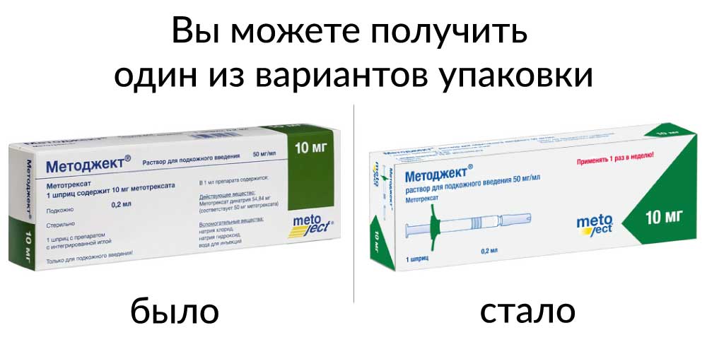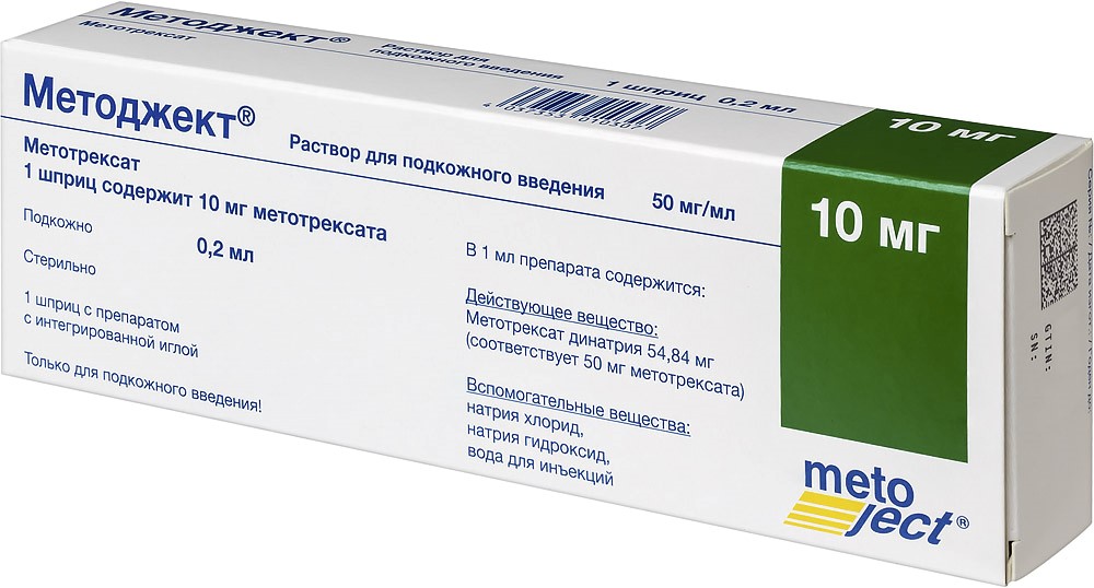 - Способ применения и дозыПрепарат Методжект® применяют подкожно. Интегрированная в шприц игла предназначена только для подкожного введения препарата Методжект®! Преперат Методжект® не следует смешивать с другими лекарственными препаратами. Препарат должен назначаться врачом, имеющим опыт применения метотрексата и знакомым со свойствами метотрексата и особенностями его действия. Препарат Методжект® предназначен только для однократного применения. Препарат Методжект® применяют один раз в неделю. Пациент должен быть ясно проинформирован об однократном еженедельном режиме введения препарата. Рекомендуется назначить для введения конкретный день недели. У пациентов с дополнительным объемом распределения (наличие асцита, плеврального выпота) скорость выведения метотрексата из организма снижена. У таких пациентов необходимо особенно тщательно проводить контроль токсичности, снизить дозу препарата, а в некоторых случаях, при необходимости, прервать лечение. Взрослые пациенты с ревматоидным артритом: Рекомендуемая начальная доза составляет 7,5 мг метотрексата 1 раз в неделю. В зависимости от активности заболевания и переносимости метотрексата больным доза может быть постепенно увеличена (по 2,5 мг в неделю). Максимальная доза при лечении ревматоидного артрита, как правило, не должна превышать 25 мг в неделю. При этом повышение дозы метотрексата до величин более 20 мг в неделю может сопровождаться существенным увеличением токсичности, в первую очередь - подавлением функции костного мозга. Ответ на лечение обычно наступает через 4-8 недель после начала применения препарата. После достижения желаемого ответа следует начинать постепенное снижение дозы до наиболее низкой эффективной поддерживающей дозы. Дети до 16 лет с полиартритной формой ювенильного хронического артрита: Рекомендуемая доза составляет 10-15 мг/м2 поверхности тела 1 раз в неделю. В случае недостаточной эффективности лечения доза может быть увеличена вплоть до 20 мг/м2 поверхности тела 1 раз в неделю. При увеличении вводимой дозы необходимо увеличить частоту проводимых обследований больного. Пациенты с ювенильным ревматоидным артритом должны наблюдаться ревматологом -специалистом по лечению детей и подростков. Использование препарата Методжект® у детей до 3 лет не рекомендовано из-за недостаточности данных об эффективности и безопасности использования препарата у этой группы пациентов. Пациенты с псориазом и псориатическим артритом: За неделю до начала лечения рекомендуется ввести парентерально тест-дозу 5-10 мг метотрексата для выявления возможных реакций непереносимости. Рекомендуемая начальная доза - 7,5 мг метотрексата 1 раз в неделю. Дозу следует постепенно увеличить, при этом максимальная доза не должна превышать 25 мг метотрексата в неделю. Применение доз свыше 20 мг в неделю может сопровождаться значительным увеличением токсичности, в первую очередь подавлением функции костного мозга. Ответ на лечение обычно наступает через 2-6 недель после начала применения препарата. После достижения желаемого ответа доза должна быть постепенно снижена до наиболее низкой эффективной поддерживающей дозы. В исключительных случаях, когда это клинически оправдано, могут применяться дозы свыше 25 мг, однако при всех случаях не более 30 мг в неделю ввиду резкого у