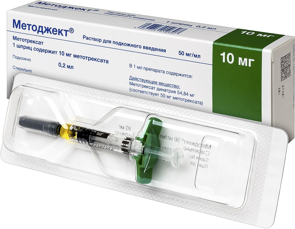 - Применение при беременности и кормлении грудьюБеременность Препарат Методжект® противопоказан во время беременности. В случае наступления беременности во время лечения метотрексатом или в течение шести месяцев после его окончания, должна быть проведена оценка риска неблагоприятного воздействия лечения на плод; для подтверждения нормального развития плода должно быть проведено соответствующее инструментальное (ультразвуковое) исследование. В исследованиях на животных была выявлена репродуктивная токсичность метотрексата, особенно в первом триместре беременности. При применении у людей метотрексат проявил тератогенные свойства; сообщалось о вызванных метотрексатом смерти плода, спонтанном прерывании беременности, врожденных пороках развития (в т.ч. краниальных, кардиоваскулярных, центральной нервной системы, конечностей). В случаях прерывания терапии метотрексатом перед оплодотворением наблюдалось нормальное течение беременности. Предохранение от беременности Пациенты детородного возраста обоих полов должны применять надежные меры контрацепции во время лечения препаратом Методжект® и в течение по меньшей мере 6 месяцев после его окончания. Женщины детородного возраста должны быть проинформированы лечащим врачом о риске пороков развития плода, связанных с лечением метотрексатом. Перед началом терапии препаратом Методжект® у женщин детородного возраста должен быть проведен надежный тест на беременность для исключения возможности проведения лечения у беременных. Данный тест следует проводить в случае необходимости в течение всего периода лечения метотрексатом (после каждого незащищенного контакта). Женщины детородного возраста должны быть проконсультированы относительно предохранения и планирования беременности. Поскольку метотрексат может проявлять генотоксическое действие, мужчинам следует воздерживаться от донорства спермы во время терапии и в течение 6 месяцев после ее окончания. Период грудного вскармливания Метотрексат выделяется с грудным молоком, поэтому, ввиду риска для младенца, следует прекратить грудное вскармливание перед началом лечения метотрексатом и воздерживаться от него в течение всего курса лечения препаратом.