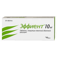 У здоровых добровольцев жирная и высококалорийная пища не влияет на AUC активного метаболита, но Сmax уменьшается на 49%, а Тmax увеличивается от 0.5 ч до 1.5 ч. Прием нагрузочной дозы лекарственного препарата Эффиент® натощак может обеспечивать более быстрое начало действия (см. раздел "Режим дозирования").