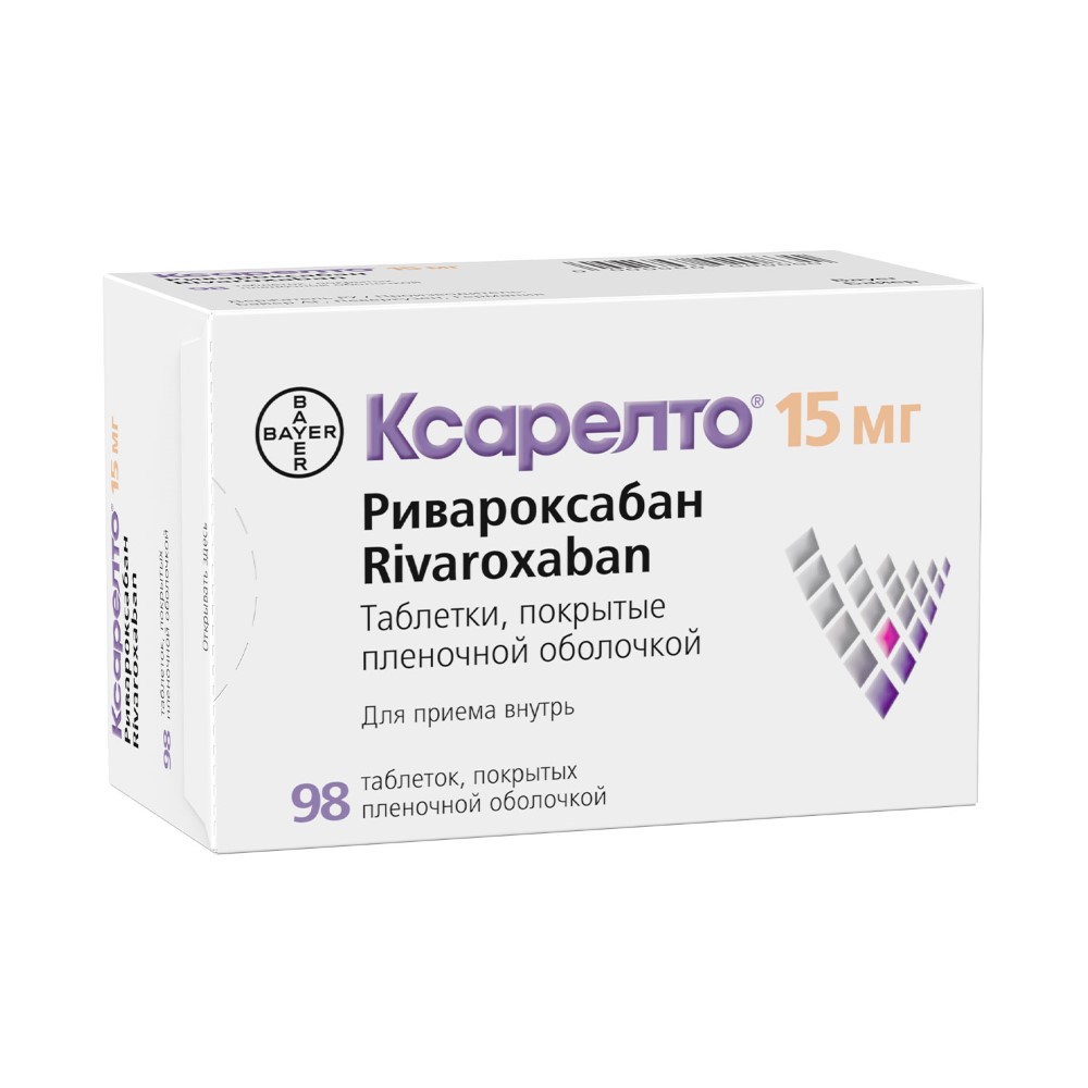 - Способ применения и дозыВсегда принимайте препарат в полном соответствии с рекомендациями лечащего врача. При появлении сомнений посоветуйтесь с лечащим врачом. Рекомендуемая доза Взрослые Для профилактики инсульта и системных тромбоэмболий Рекомендуемая доза: 1 таблетка препарата Ксарелто® 20 мг один раз в день. Если у Вас есть проблемы с почками, доза может быть уменьшена до 1 таблетки препарата Ксарелто® 15 мг один раз в день. В случае, если у Вас запланирована операция, направленная на восстановление кровотока в сосудах сердца (чрескожное коронарное вмешательство [ЧКВ] с установкой стента), существуют ограниченные данные о необходимости снижения дозы до 1 таблетки препарата Ксарелто® 15 мг один раз в день (или до 1 таблетки препарата Ксарелто® 10 мг один раз в день, если Ваши почки не работают должным образом) в дополнение к антитромботическому препарату, например, клопидогрелу. Для лечения тромбоза глубоких вен (ТГВ) и тромбоэмболии легочной артерии (ТЭЛА) или профилактики повторных ТГВ/ТЭЛА Рекомендуемая доза: 1 таблетка препарата Ксарелто® 15 мг два раза в день в течение первых 3 недель; 1 таблетка 20 мг один раз в день после 3 недель лечения. После как минимум 6 месяцев лечения Ваш врач может принять решение продолжить лечение с использованием следующих дозировок: 1 таблетка 10 мг один раз в день или 1 таблетка 20 мг один раз в день. Если у Вас есть проблемы с почками и Вы принимаете по 1 таблетке препарата Ксарелто® 20 мг один раз в день, Ваш врач может принять решение о снижении дозы для лечения после 3 недель до 1 таблетки препарата Ксарелто® 15 мг один раз в день, если риск кровотечения выше, чем риск образования повторных ТГВ/ТЭЛА. Применение у детей и подростков Лечение препаратом Ксарелто® у детей и подростков в возрасте до 18 лет должно быть начато после предварительного лечения инъекционными антикоагулянтами длительностью не менее, чем 5 дней. Доза препарата Ксарелто® зависит от массы тела и будет рассчитана Вашим лечащим врачом. Дети и подростки с массой тела от 30 кг и менее 50 кг: рекомендованная доза составляет по 1 таблетке препарата Ксарелто® 15 мг один раз в день, что является максимальной суточной дозой. Дети и подростки с массой тела 50 кг или более: рекомендованная доза составляет по 1 таблетке препарата Ксарелто® 20 мг один раз в день, что является максимальной суточной дозой. Дети с массой тела менее 30 кг: может применяться препарат Ксарелто® в форме гранул для приготовления суспензии для приема внутрь для детей. Проконсультируйтесь с лечащим врачом о том, какая форма препарата лучше подходит для Вашего ребенка. Важно соблюдать график посещений врача, поскольку может потребоваться увеличить дозу из-за увеличения массы тела. Никогда не увеличивайте дозу самостоятельно. Ваш врач увеличит дозу, если это будет необходимо. Путь и (или) способ введения Взрослые Принимайте внутрь во время приема пищи, в одно и то же время каждый день, запивая водой или соком. Если Вы не можете проглотить таблетку целиком, обсудите с врачом другие способы приема препарата Ксарелто®. Таблетку можно измельчить и смешать с водой или яблочным пюре непосредственно перед приемом. Вам также могут ввести измельченную таблетку через зонд для кормления, если это необходимо. Дети с массой тела не менее 30 кг Давайте Вашему ребенку препарат во время приема п