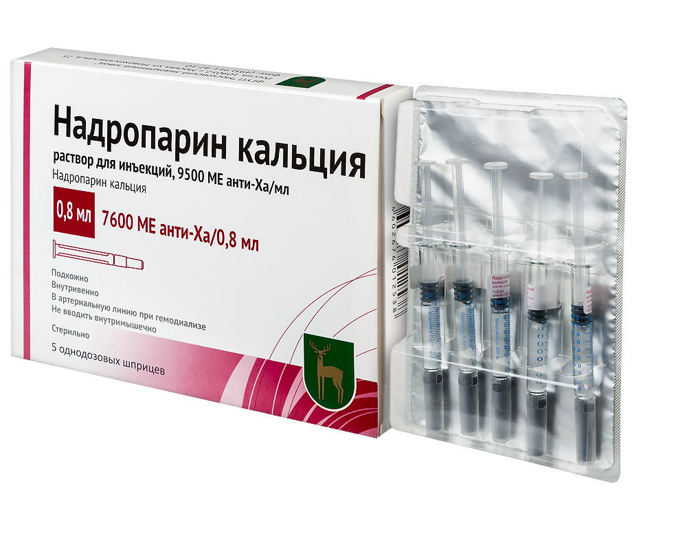 - Состав1 мл раствора содержит: Действующее вещество: надропарин кальция - 9500 МЕ анти-Ха-факторной активности Вспомогательные вещества: кальция гидроксид или хлористоводородная кислота - до рН 4,5-7,5, вода для инъекций - до 1,0 мл. Состав на 1 шприц, объем наполнения 0,8 мл: Действующее вещество: Надропарин кальция - 7600 МЕ анти-Ха-факторной активности Вспомогательные вещества: Кальция гидроксид или Хлористово-дородная кислота - до рН 4,5-7,5 Вода для инъекций - до 0,8 мл