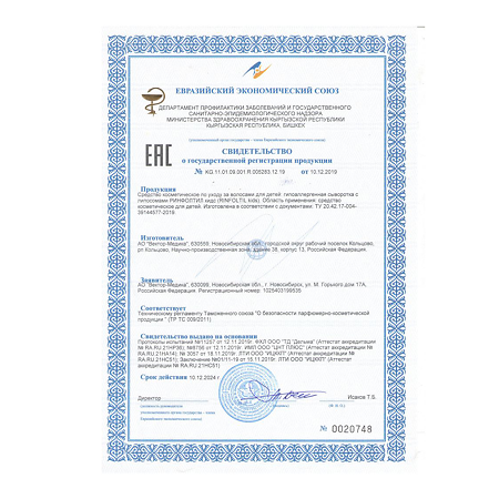 - Свидетельство о государственной регистрации KG.11.01.09.001.R.005283.12.19 от 10.12.2019.