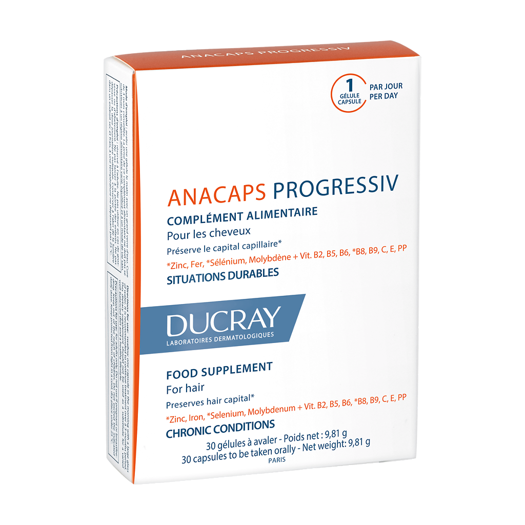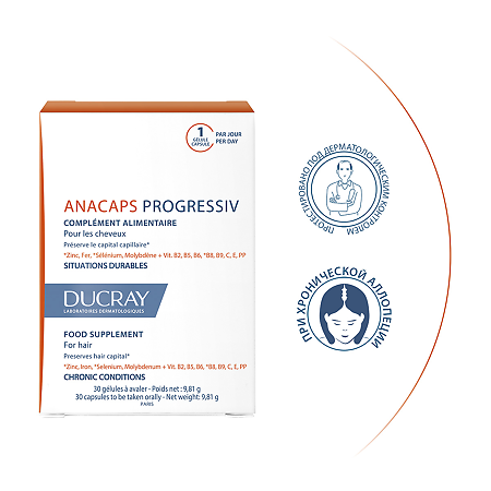 Капсулы на растительной основе не содержат глютен, Ducray Anacaps Progressiv обладает хорошей пищевой переносимостью. Сохранность железа достигает 100% РСН.