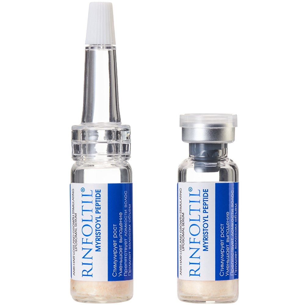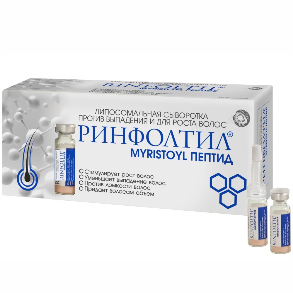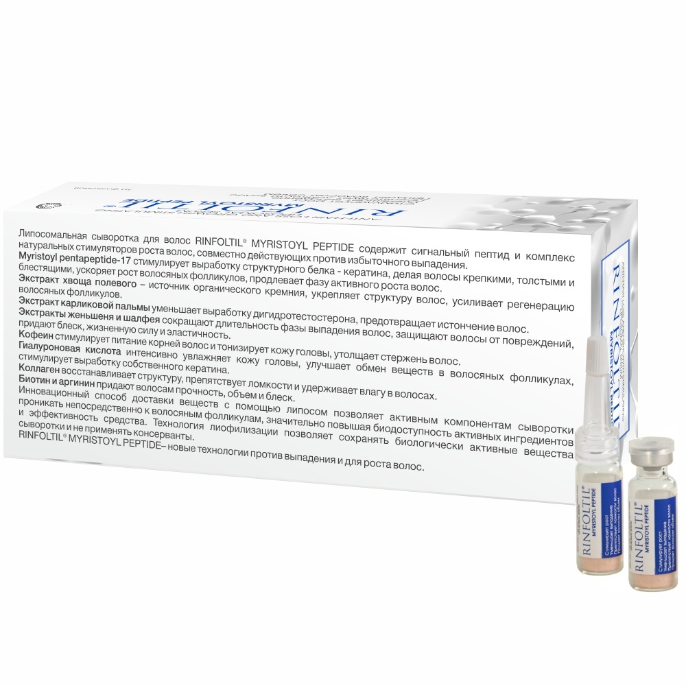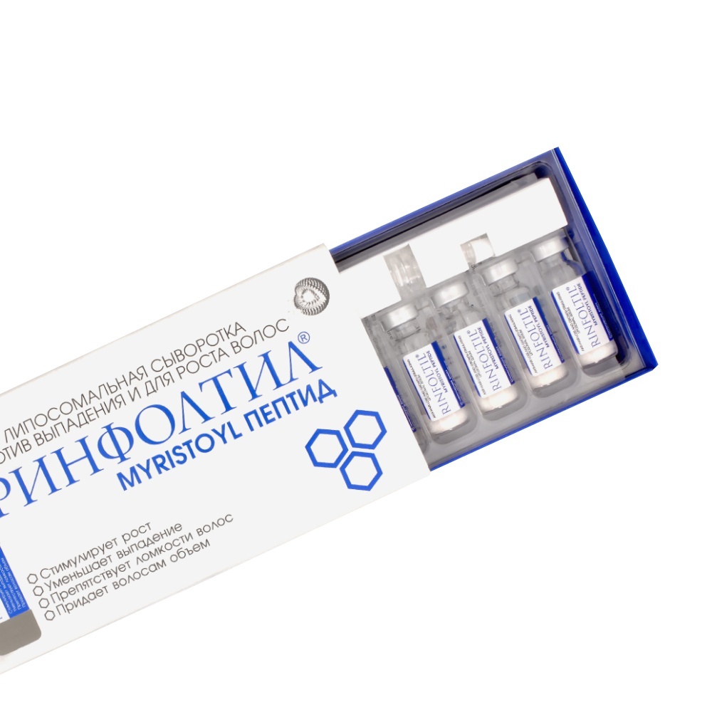 Липосомальная сыворотка для волос RINFOLTIL® MYRISTOYL PEPTIDE содержит сигнальный пептид и комплекс натуральных стимуляторов роста волос, совместно действующих против избыточного выпадения.