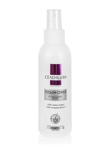 Укрепляющий лосьон-спрей Селенцин "Hair Therapy" - уникальный лосьон на основе французского запатентованного комплекса Anageline®, рекомендуемый для предотвращения хронического, длительного выпадения и поредения волос, для укрепления и восстановления жизненного цикла волосяных фолликулов. Является одним из лучших средств для ухода за выпадающими, ломкими, секущимися и истонченными волосами. Улучшая микроциркуляцию крови и доставку питательных веществ непосредственно к корням волос, укрепляет корни, увеличивает диаметр каждого волоса и количество волос в стадии роста, препятствует выпадению тонких пушковых волос, переводя их во взрослую здоровую фазу.