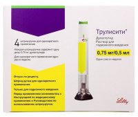 - Показания к применениюПрепарат Трулисити показан у взрослых пациентов с сахарным диабетом 2 типа с целью улучшения гликемического контроля в виде: — монотерапии В случае, если диета и физические упражнения не обеспечивают необходимого гликемического контроля у пациентов, которым не показано применение метформина по причине непереносимости или наличия противопоказаний. — комбинированной терапии В сочетании с другими гипогликемическими препаратами, включая инсулин, если данные препараты вместе с диетой и физическими упражнениями не обеспечивают необходимого гликемического контроля.
