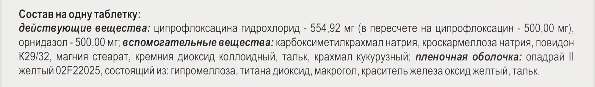 - СоставСостав на одну таблетку: действующие вещества: ципрофлоксацина гидрохлорид - 554,92 мг в пересчете на ципрофлоксацин 500,00 мг, орнидазол – 500,00 мг; вспомогательные вещества: карбоксиметилкрахмал натрия – 141,44 мг, кроскармеллоза натрия – 50,00 мг, повидон К29/32 – 17,40 мг, магния стеарат – 7,80 мг, кремния диоксид коллоидный – 16,60 мг, тальк – 9,30 мг, крахмал кукурузный - до 1420,00 мг; пленочная оболочка: опадрай II желтый 02F22025 – 42,00 мг, состоящий из: гипромеллоза – 26,25 мг, титана диоксид – 11,23 мг, макрогол – 2,625 мг, краситель железа оксид желтый – 1,47 мг, тальк – 0,42 мг.