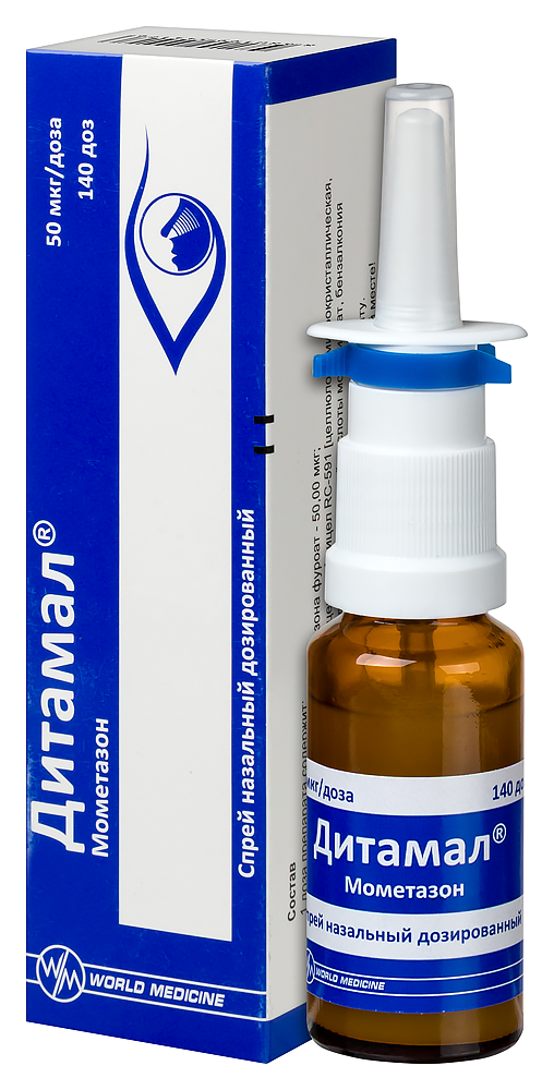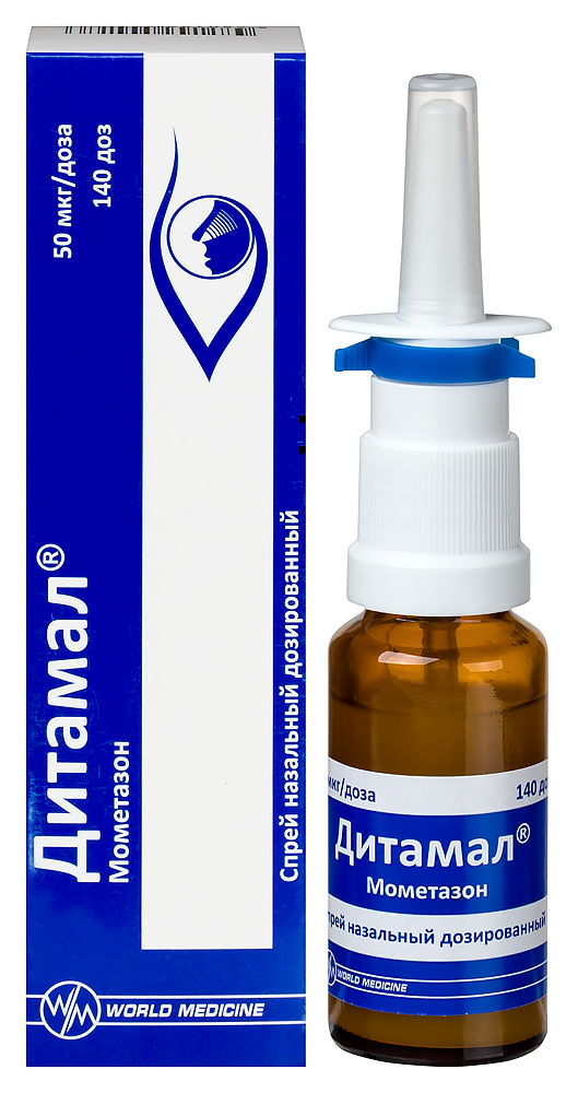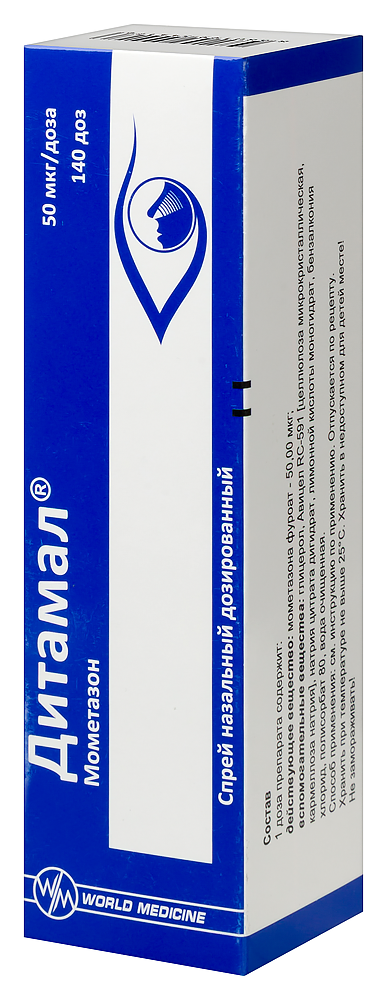 - ПротивопоказанияГиперчувствительность к мометазону или любому из компонентов препарата; Недавнее оперативное вмешательство или травма носа с повреждением слизистой оболочки носовой полости - до заживления раны (в связи с ингибирующим действием глюкокортикостероидов процессы заживления); Детский возраст (при сезонном и круглогодичном аллергические ринитах - до 2 лет; при остром синусите или обострениях хронического синусита - до 12 лет; при полипозе носа - до 18 лет) - в связи с отсутствием опыта применения. С осторожностью: Дитамал® следует применять с осторожностью при туберкулезной инфекции (активной или латентной) респираторного тракта, нелеченной грибковой, бактериальной или системной вирусной инфекции, вызванной Herpes simplex с поражением глаз (в виде исключения возможно применение препарата при перечисленных инфекциях по указанию врача), наличие нелеченной местной инфекции с вовлечением в процесс слизистой оболочки носовой полости. Беременность и лактация: Специальных исследований действия препарата у беременных не проводилось. Препарат следует применять во время беременности и в период грудного вскармливания только в том случае, если ожидаемый положительный эффект для матери превышает потенциальный риск для плода или младенца. Младенцы, матери которых во время беременности получали глюкокортикостероиды, должны быть тщательно обследованы в отношении возможной гипофункции надпочечников.
