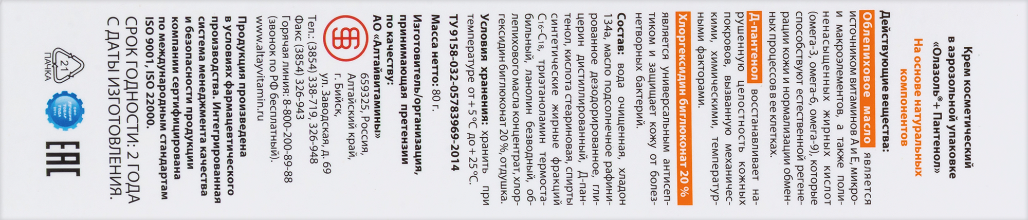 Облепиховое масло является источником витаминов А и Е, микро- и макроэлементов, а также полиненасыщенных жирных кислот (омега-3, омега-6, омега-9), которые способствуют естественной регенерации кожи и нормализации обменных процессов в её клетках.
