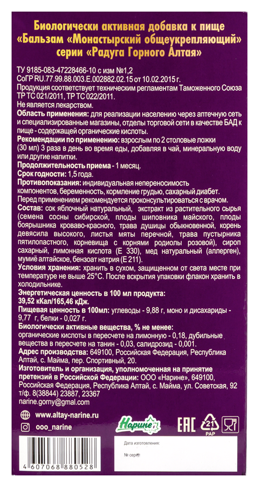 Содержание Биологически активных веществ, мг/100мл: органические кислоты в пересчете на лимонную - 0,18, дубильные вещества в пересчете на танин - 0,03, салидрозид - 0,001, иридоиды - идентификация.