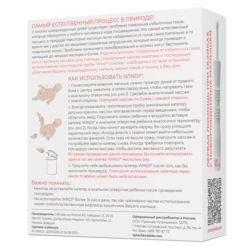 Катетер WINDI предназначен для одноразового использования с целью избавления малышей от избыточных газов.