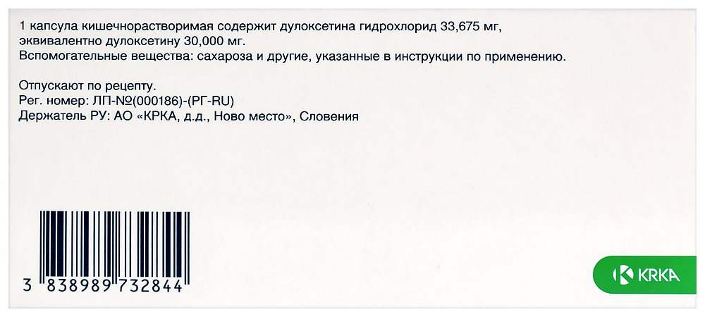 - Состав1 капсула кишечнорастворимая 30 мг содержит пеллеты: Действующее вещество: Дулоксетина гидрохлорид 33,675 мг, эквивалентно дулоксетину 30,000 мг Вспомогательные вещества: сахарная крупка, гипромеллоза 6сР, сахароза, гипромеллозы фталат НР-50, тальк, триэтилцитрат Твердые желатиновые капсулы № 3 Корпус: титана диоксид (Е171), желатин Крышечка: индигокармин (Е132), титана диоксид (Е171), желатин Состав чернил: шеллак (Е904), этанол (Е1510), изопропанол, бутанол, пропиленгликоль (Е1520), аммиак водный (Е527), краситель железа оксид черный (Е172), калия гидроксид (Е525), вода очищенная Свернуть