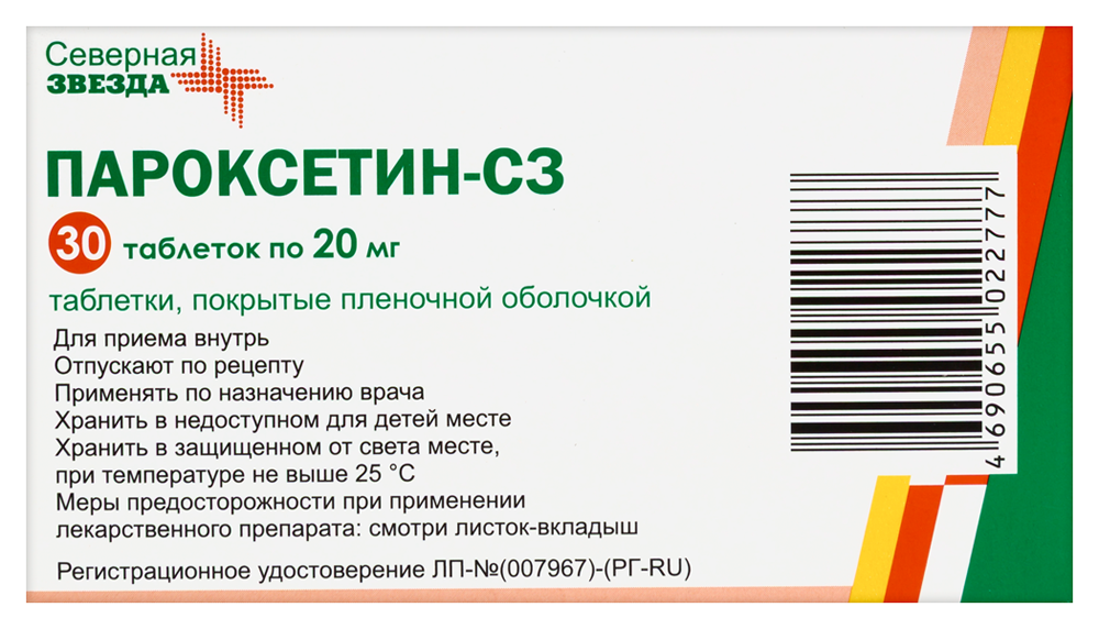 - Способ применения и дозыПрепарат Пароксетин-СЗ рекомендуется принимать 1 раз в сутки утром во время еды. Таблетки следует глотать, не разжевывая. Нанесенная риска позволяет при необходимости делить таблетку пополам для получения дозы 10 мг. • Депрессивные эпизоды средней и тяжелой степени тяжести и рекуррентное депрессивное расстройство Рекомендуемая доза составляет 20 мг в сутки. При необходимости доза может быть увеличена с шагом 10 мг в сутки до максимальной дозы 50 мг в сутки в зависимости от клинического ответа. Как и при лечении любыми антидепрессантами, следует оценивать эффективность терапии и при необходимости корректировать дозу Пароксетин-СЗ через 2-3 недели после начала лечения и в дальнейшем в зависимости от клинических показаний. Пациенты с депрессией должны проходить лечение в течение достаточного периода времени для достижения бессимптомного состояния. Этот период может составлять несколько месяцев. • Обсессивно-компульсивное расстройство (ОКР) Рекомендуемая доза составляет 40 мг в сутки. Лечение пациентов следует начинать с дозы 20 мг в сутки, которую можно еженедельно повышать на 10 мг в сутки. При необходимости доза может быть увеличена до максимальной дозы 60 мг в сутки. Пациенты с ОКР должны проходить лечение в течение достаточного периода времени для достижения бессимптомного состояния. Этот период может составлять несколько месяцев. • Паническое расстройство Рекомендуемая доза составляет 40 мг в сутки. Лечение пациентов следует начинать с дозы 10 мг в сутки, которую можно еженедельно повышать на 10 мг в сутки в зависимости от клинического эффекта. При необходимости доза может быть увеличена до максимальной дозы 60 мг в сутки. Низкая начальная доза рекомендуется для минимизации возможного усиления симптоматики панического расстройства, которая может возникать в начале лечения данного расстройства. Пациенты с паническим расстройством должны проходить лечение в течение достаточного периода времени для достижения бессимптомного состояния. Этот период может составлять несколько месяцев или более. • Социальная фобия Рекомендуемая доза составляет 20 мг в сутки. При необходимости пациентам, у которых не наблюдается ответ при использовании 20 мг в сутки, доза может быть увеличена с шагом 10 мг в сутки до максимальной дозы 50 мг в сутки в зависимости от клинического ответа. • Генерализованное тревожное расстройство Рекомендуемая доза составляет 20 мг в сутки. При необходимости доза может быть увеличена с шагом 10 мг в сутки до максимальной дозы 50 мг в сутки в зависимости от клинического ответа. • Посттравматическое стрессовое расстройство Рекомендуемая доза составляет 20 мг в сутки. При необходимости доза может быть увеличена с шагом 10 мг до максимальной дозы 50 мг в сутки в зависимости от клинического ответа. Общая информация Отмена пароксетина. Как и при лечении другими психотропными препаратами, следует избегать резкой отмены Пароксетин-СЗ. Схема постепенного уменьшения дозы, использованная в последних клинических исследованиях, заключалась в снижение суточной дозы на 10 мг в неделю. После достижения дозы 20 мг в сутки пациенты продолжали принимать эту дозу в течение 1 недели, и лишь после этого препарат отменяли полностью. Если симптомы отмены развиваются во время снижения дозы или после отмены преп
