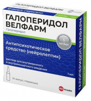 - ВзаимодействиеОдновременное применение лекарственных средств, вызывающих нарушение электролитного баланса, требует повышенной осторожности - может повышаться риск развития желудочковых аритмий. Применения диуретиков, вызывающих гипокалиемию, рекомендуется избегать и отдавать предпочтение калийсберегающим диуретикам.<br />Галоперидол потенцирует угнетающее действие на центральную нервную систему гипотензивных лекарственных средств, наркотических анальгетиков, снотворных средств, трициклических антидепрессантов, средств для общей анестезии, алкоголя. Одновременный прием галоперидола с этими препаратами может привести к угнетению дыхания.<br />При одновременном применении с противопаркинсоническими препаратами (леводопа и др.) может снижаться терапевтическое действие этих лекарственных средств из-за антагонистического влияния на дофаминергические структуры.<br />При применении с метилдопой возможно развитие дезориентации, затруднения и замедления процессов мышления.<br />Галоперидол может снижать интенсивность действия эпинефрина и других симпатомиметиков, вызывать "парадоксальное" снижение артериального давления и тахикардию при их совместном применении.<br />Усиливает действие периферических м-холиноблокаторов и большинства гипотензивных средств (снижает действие гуанетидина вследствие вытеснения его из α-адренергических нейронов и подавления его захвата этими нейронами).<br />При комбинированном приеме с противосудорожными средствами (включая барбитураты и др. индукторы микросомального окисления), дозы последних следует повысить, т.к. галоперидол снижает порог судорожной активности.<br />Кроме того, могут снижаться и сывороточные концентрации галоперидола. В частности, при одновременном употреблении чая или кофе действие галоперидола может ослабевать.<br />Галоперидол может снижать эффективность непрямых антикоагулянтов, поэтому при совместном приеме дозу последних следует корректировать.<br />Галоперидол замедляет метаболизм трициклических антидепрессантов и ингибиторов моноаминоксидазы (МАО), вследствие чего повышается их концентрация в плазме крови и токсичность.<br />При одновременном применении с бупропионом снижает эпилептический порог и увеличивает риск возникновения эпилептических припадков.<br />При одновременном приеме галоперидола с флуоксетином, хинидином, буспироном возрастает риск побочного действия на центральную нервную систему, особенно экстрапирамидных реакций. При необходимости одновременного применения дозу галоперидола следует снизить.<br />Ингибиторы или субстраты изофермента CYP3A4 и CYP2D6, такие как, итраконазол, буспирон, венлафаксин, алпразолам, флувоксамин, хинидин, флуоксетин, сертралин, хлорпромазин, прометазин могут повышать концентрацию галоперидола в плазме крови. Снижение активности изофермента CYP2D6 может приводить к повышению концентрации галоперидола. Сообщалось о случаях удлинения интервала QT и экстрапирамидных симптомах в случае одновременного применения галоперидола с кетоконазолом (400 мг/сут) и пароксетином (20 мг/сут). Может потребоваться коррекция дозы галоперидола.<br />Одновременное применение галоперидола с препаратами, удлиняющими интервал QT, например, антиаритмические препараты IA (в т.ч. хинидин, дизопирамид, прокаинамид) и III (в т.ч. амиодарон, сота