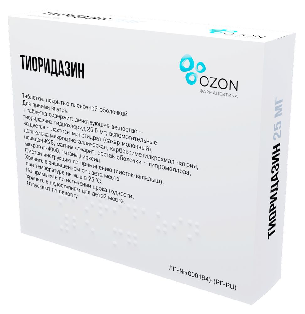 - СоставСостав на 1 таблетку: Действующее вещество: тиоридазина гидрохлорид - 25,00 мг. Вспомогательные вещества: лактозы моногидрат (сахар молочный) - 111,80 мг; целлюлоза микрокристаллическая - 38,00 мг; карбоксиметилкрахмал натрия - 7,60 мг; повидон-К25 - 5,70 мг; магния стеарат - 1,90 мг Состав оболочки: гипромеллоза - 2,90 мг; макрогол-4000 - 0,85 мг; титана диоксид - 1,25 мг.