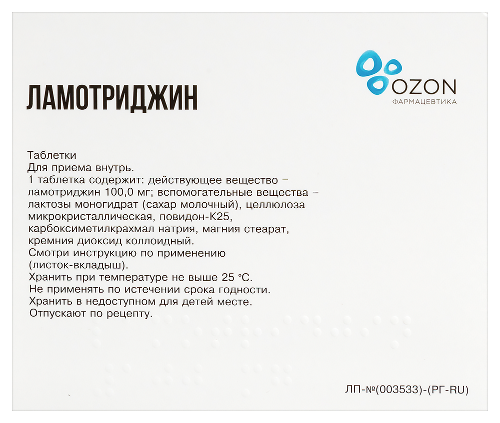- Состав1 таблетка содержит: Действующее вещество: ламотриджин – 100,00 мг. Вспомогательные вещества: лактозы моногидрат (сахар молочный) – 167,80 мг; целлюлоза микрокристаллическая – 76,00 мг; повидон-К25 – 19,00 мг; карбоксиметилкрахмал натрия – 11,40 мг; магния стеарат – 3,80 мг; кремния диоксид коллоидный – 2,00 мг.
