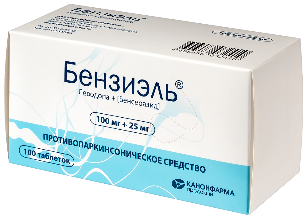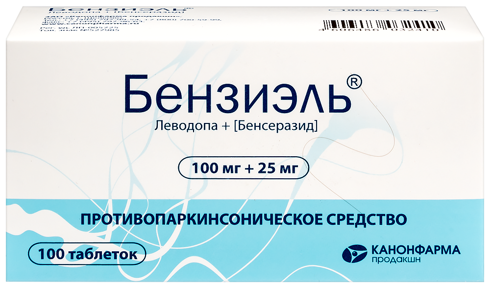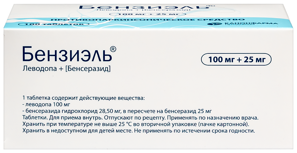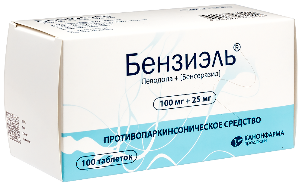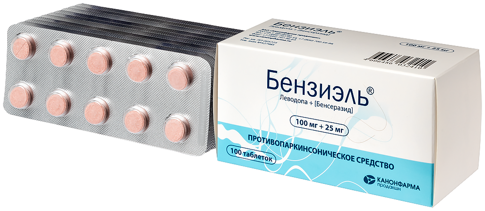 - Способ применения и дозыВнутрь, не менее чем за 30 мин до или через 1 ч после еды, таблетки можно размельчать для облегчения глотания. Болезнь Паркинсона Стандартный режим дозирования Лечение следует начинать с малой дозы, постепенно увеличивая дозу для каждого пациента индивидуально до достижения терапевтического эффекта. Начальная терапия На ранней стадии болезни Паркинсона рекомендуется начинать лечение препаратами леводопы/бенсеразида с приема 62,5 мг (50 мг леводопы + 12,5 мг бенсеразида) 3-4 раза в сутки. При переносимости схемы начального дозирования дозу нужно медленно увеличивать в зависимости от реакции пациента. Оптимальный эффект обычно достигается при суточной дозе в 300-800 мг леводопы + 75-200 мг бенсеразида, принимаемой в три или более приемов. Для достижения оптимального эффекта может потребоваться от 4 до 6 недель. При необходимости дальнейшего увеличения суточной дозы это следует делать с промежутками в 1 месяц. Поддерживающая терапия Средняя поддерживающая доза - 125 мг (100 мг леводопы +- 25 мг бенсеразида) 3-6 раз в сутки. Число приемов (не менее трех) и их распределение в течение дня должно обеспечить оптимальный эффект. Синдром "беспокойных ног" Максимально допустимая доза в сутки - 500 мг препарата Бензиэль® (400 мг леводопы + 100 мг бенсеразида). За 1 ч до сна с небольшим количеством пищи. Перед применением препарата Бензиэль® следует воздержаться от приема пищи, богатой белком. Идиопатический синдром "беспокойных ног" с нарушениями засыпания Начальная доза препарата Бензиэль®: 62,5 мг (50 мг леводопы + 12,5 мг бенсеразида) - 125 мг (100 мг леводопы + 25 мг бенсеразида). При недостаточном эффекте следует увеличить дозу препарата до 250 мг (200 мг леводопы + 50 мг бенсеразида). Идиопатический синдром "беспокойных ног" с нарушениями засыпания и сна Начальная доза препарата Бензиэль®: 125 мг (100 мг леводопы + 25 мг бенсеразида). При недостаточном эффекте рекомендуется увеличить дозу препарата до 250 мг (200 мг леводопы + 50 мг бенсеразида). Идиопатический синдром "беспокойных йог" с нарушениями засыпания и сна, а также с нарушениями в течение суток Дополнительно: 125 мг (100 мг леводопы + 25 мг бепсеразида), максимально допустимая суточная доза - 500 мг (400 мг леводопы + 100 мг бепсеразида) препарата Бензиэль®. Синдром "беспокойных ног" у пациентов с хронической почечной недостаточностью, получающих диализ 125 мг препарата Бензиэль® (100 мг леводопы + 25 мг бепсеразида) за 30 минут до начала диализа. Дозирование в особых случаях Болезнь Паркинсона Препарат Бензиэль® можно комбинировать с другими противопаркинсоническими средствами, по мере продолжения лечения может возникнуть необходимость в уменьшении дозы других препаратов или их постепенной отмене. У пациентов с почечной недостаточностью легкой или умеренной степени тяжести коррекции дозы не требуется. Препарат Бензиэль® хорошо переносится пациентами, находящимися на гемодиализе. При длительном лечении возможно появление флюктуаций - эпизодов "застывания", ослабления эффекта к концу периода действия дозы, феномена "включения-выключения". Для устранения этих симптомов пли уменьшения их выраженности следует провести коррекцию дозы, возможно, путем назначения меньших доз, но чаще. Впоследствии можно попробовать вновь увеличить дозу для усиления терапевтического эффекта. Синдром "беспокойных ног" Для исключен