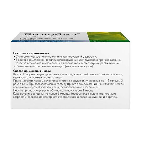 При головокружении вестибулярного происхождения и симптоматическом лечении тиннитуса: 3 капсулы в день, распределенные в течение дня.