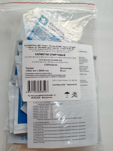 В салфетке содержится не менее 0,8 г раствора спирта. Вскрытие упаковки не требует ножниц.