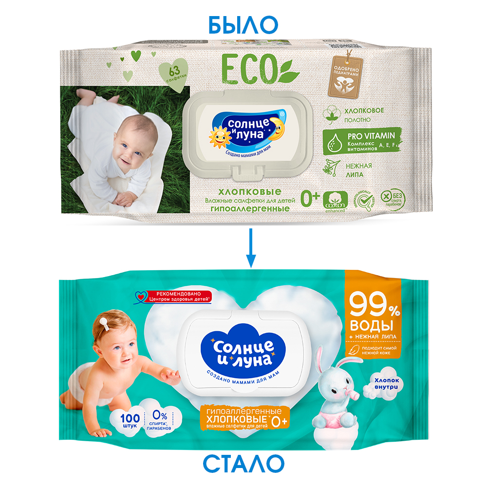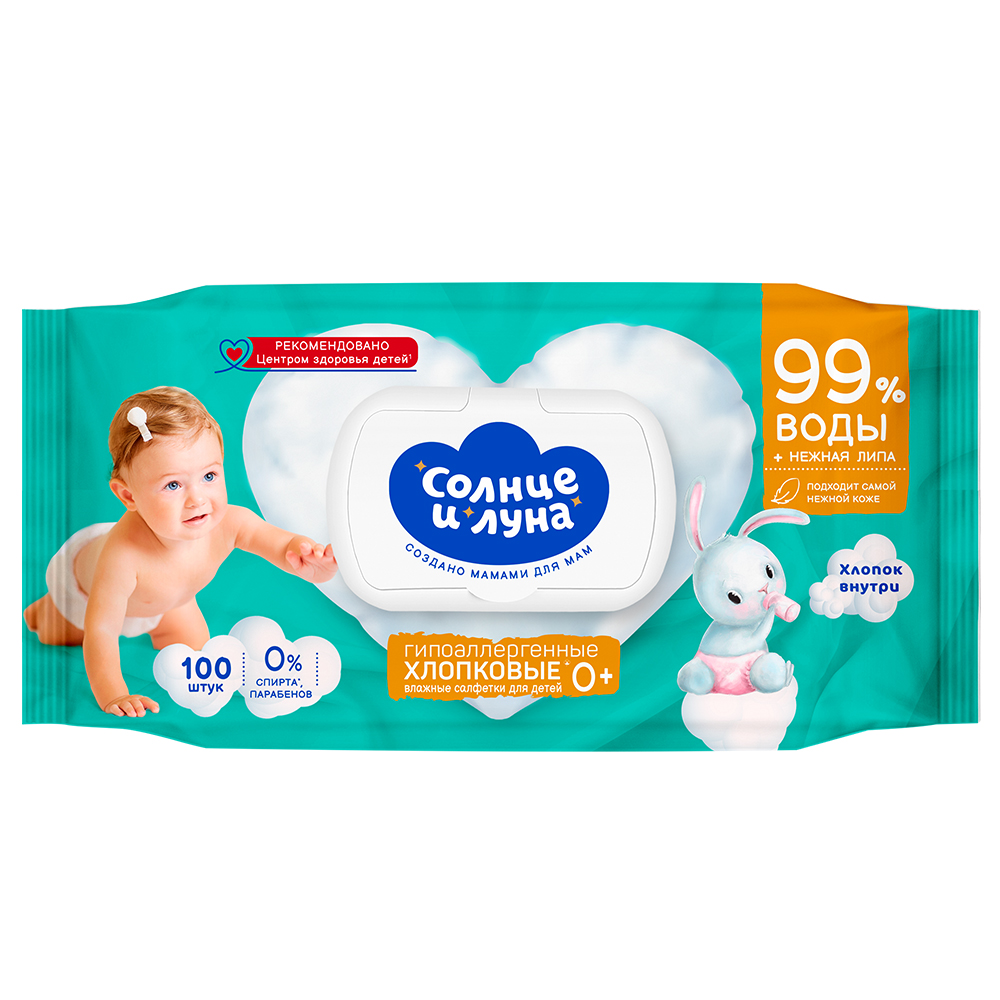 СОЛНЦЕ И ЛУНА САЛФЕТКИ ВЛАЖ ДЛЯ ДЕТЕЙ ХЛОПКОВЫЕ С ВИТАМИНАМИ A E F И НЕЖНОЙ ЛИПОЙ - мягкая и приятная салфетка из хлопковых волокон, не вызывает раздражения нежной кожи новорожденных