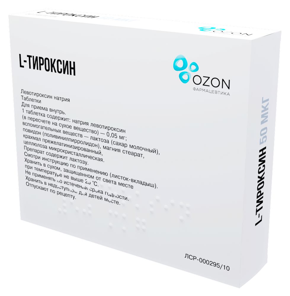 - Состав1 таблетка 50 мкг содержит: Действующее вещество: натрия левотироксин (в перерасчете на сухое вещество) - 0,05 мг. Вспомогательные вещества: лактоза (сахар молочный) - 75,0 мг, повидон (поливинилпирролидон) - 2,45 мг, магния стеарат - 0,5 мг, крахмал прежелатинизированный - 5,0 мг, целлюлоза микрокристаллическая - 17,0 мг.