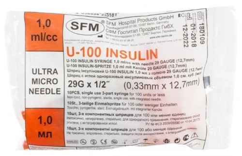 Шприц инъекционный инсулиновый SFM 1 мл, (шкала U-100) - применяют для инъекций инсулина