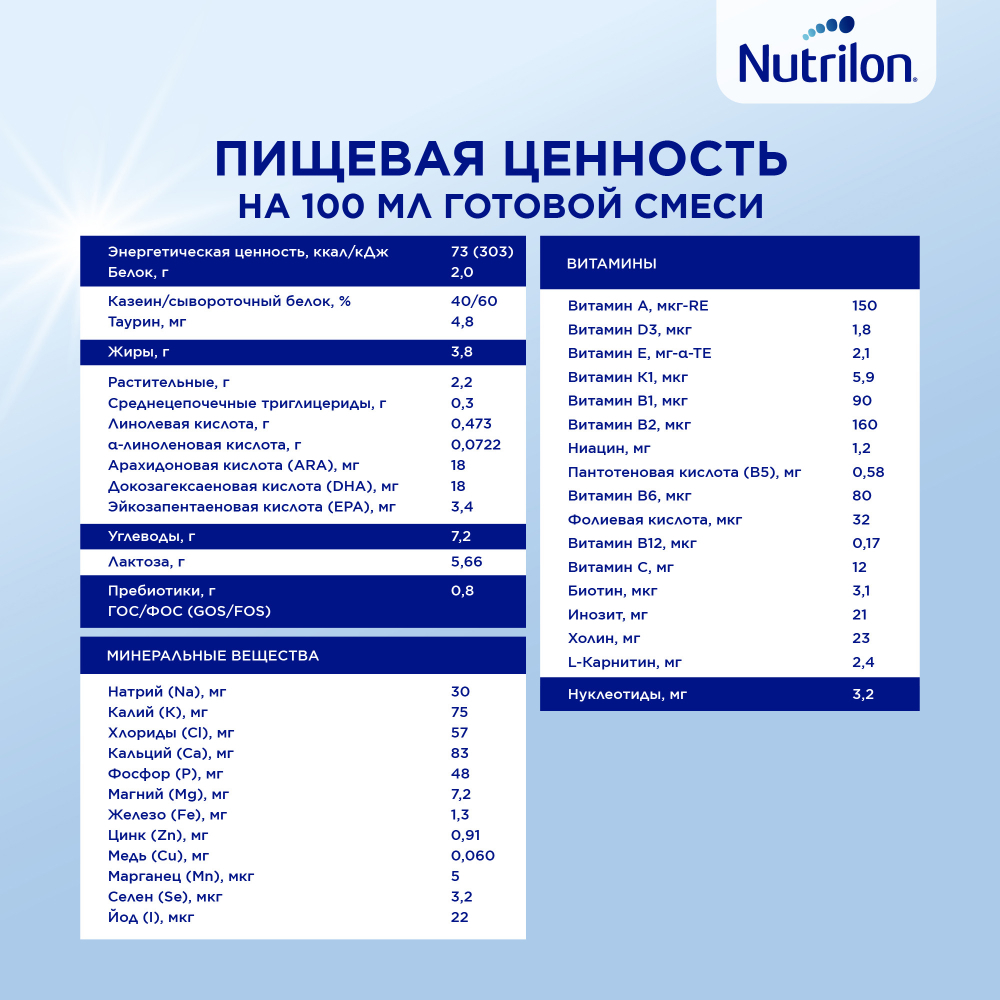 НУТРИЛОН ПРЕ 1, ПИЩЕВАЯ ЦЕННОСТЬ НА 100 МЛ