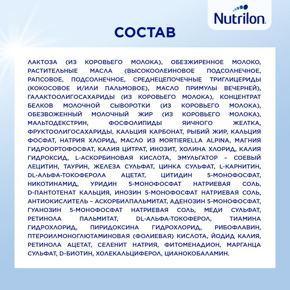 Особенностями Nutrilon® Pre 1 (с молочными липидами Pro Lipids*) являются повышенное содержание белка для активного роста, молочные липиды для лучшего переваривания смеси и усвоения жирных кислот и специальный витаминно-минеральный комплекс, который отвечает особым потребностям недоношенных малышей.