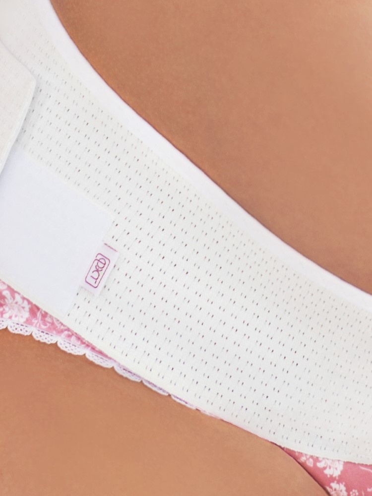 Бандаж представляет собой пояс, выполненный из перфорированной бандажной тесьмы, с застежками для регулировки степени поддержки.