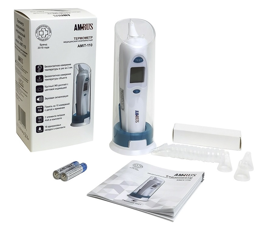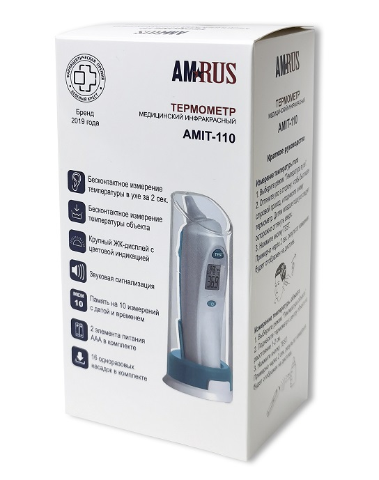 Инфракрасный медицинский термометр AMRUS AMIT-110 предназначен для измерения температуры тела человека (в ухе) и предметов бесконтактным способом.