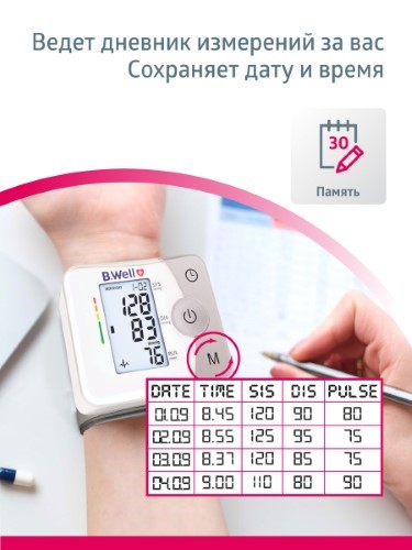 -Полноценный контроль давления: память на 30 измерений с датой и временем