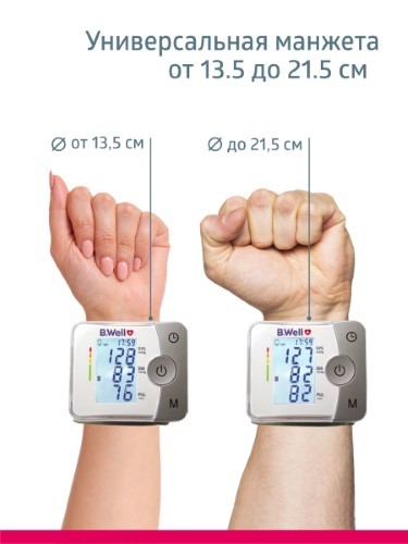 Универсальный размер манжеты до 21,5 см подходит на запястье любой полноты, мужчинам и женщинам.