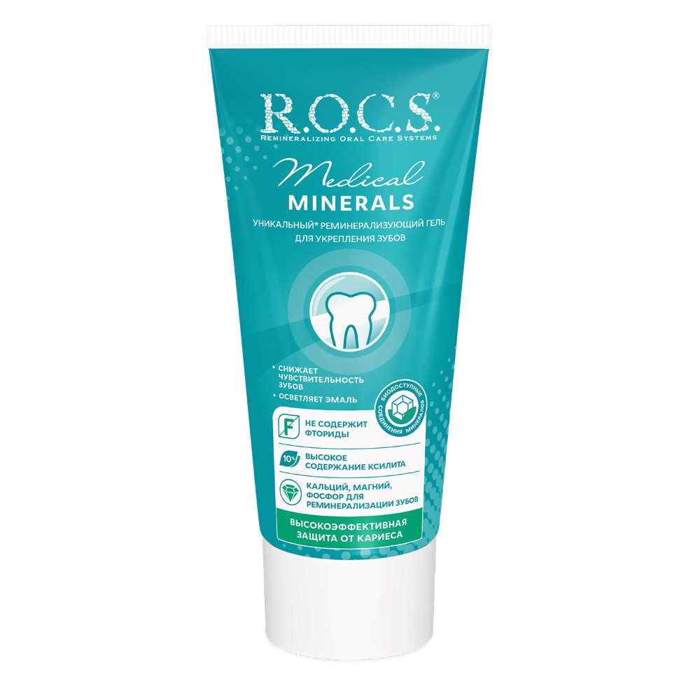 Реминерализующий гель для укрепления зубов R.O.C.S. «Medical Minerals» - это уникальный источник активных, биологически доступных соединений кальция, магния и фосфора. Продукт имеет безопасный сбалансированный состав и оказывает широкое лечебно-профилактическое действие. При регулярном использовании, ROCS «Medical Minerals» укрепляет и осветляет эмаль, возвращает ей красивый блеск, снижает повышенную чувствительность зубов, обеспечивает эффективную профилактику кариеса, устраняет эстетические недостатки при клиновидных дефектах, флюорозе, эрозиях и т.д. Гель не содержит фтор и безопасен при проглатывании.