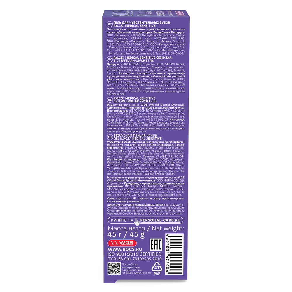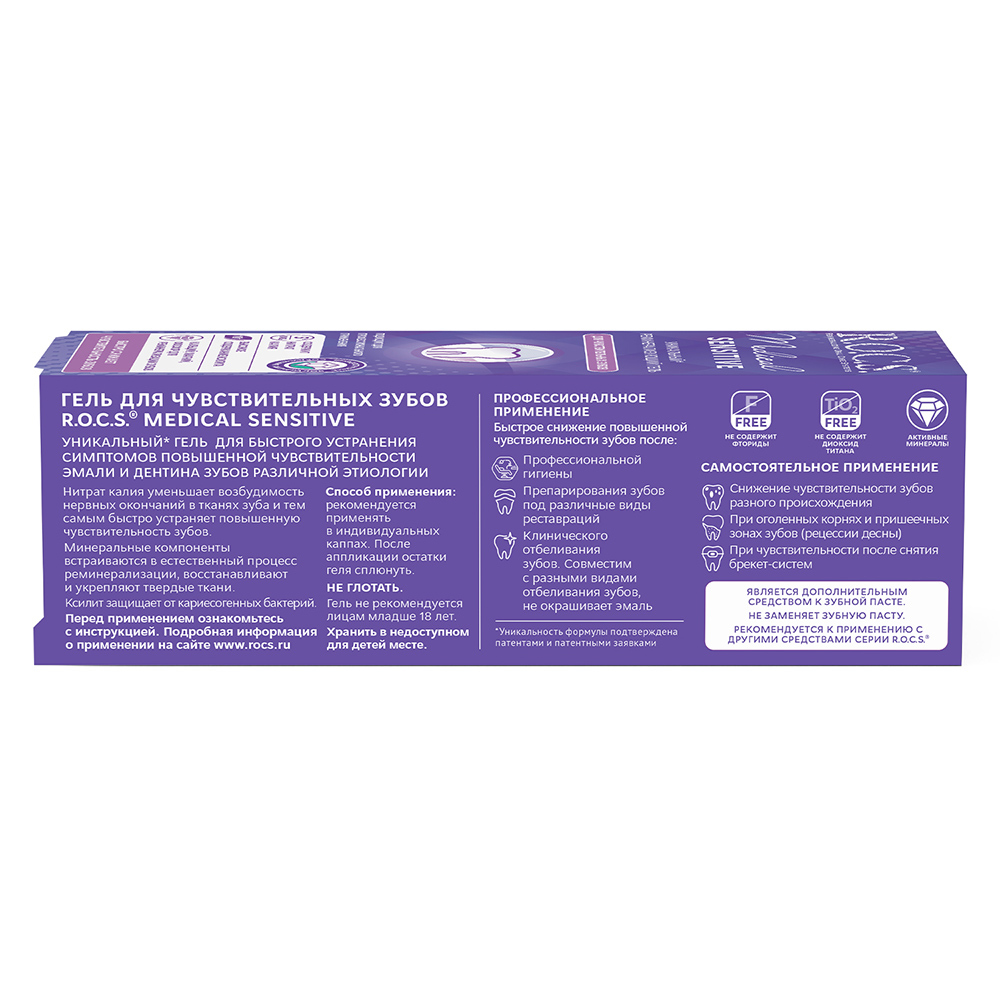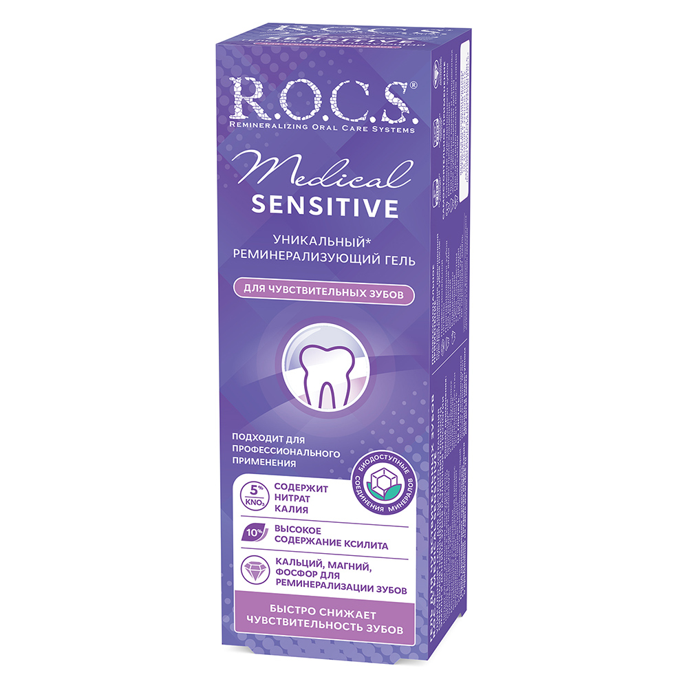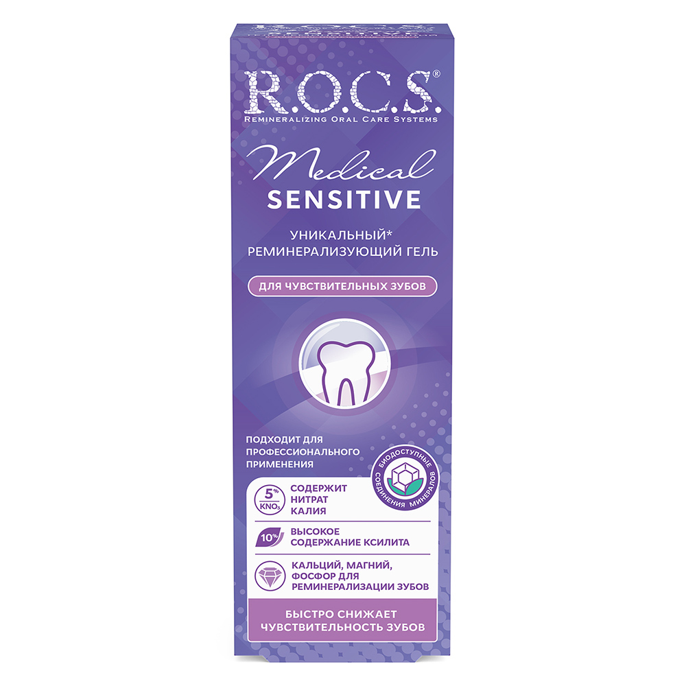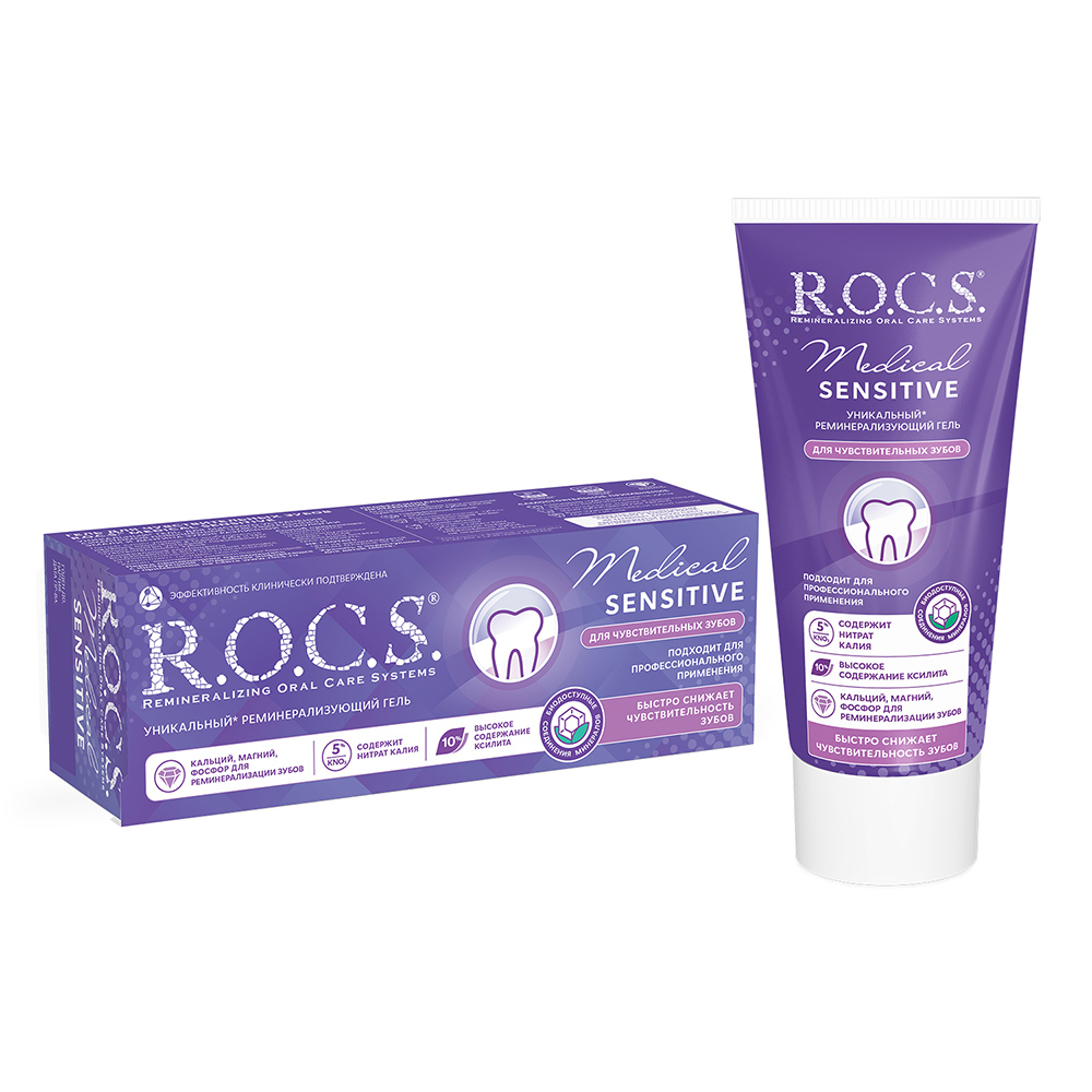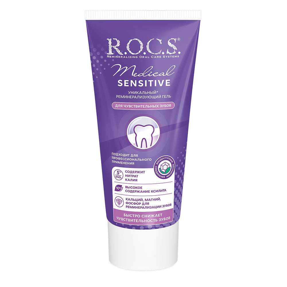Стоматологический гель для чувствительных зубов R.O.C.S. «Medical Sensitive» (РОКС «Медикал Сенситив») позволяет эффективно и быстро снять симптомы повышенной чувствительности зубов, предотвратить возникновение болевых ощущений после профессиональной чистки или офисного отбеливания, а также, выполнить реминерализацию твердых тканей зуба (дентина и эмали). Гель демонстрирует высокие положительные результаты использования, и эффективен в комплексе мероприятий по эстетическому (прямому и непрямому) реставрированию зубов, в ортодонтическом лечении, применяется для быстрого устранения гиперестезии любого иного генеза. РОКС «Медикал Сенситив» является богатым источником биологически доступных соединений фосфора, кальция и магния, благодаря чему не просто снимает неприятные ощущения, но и оздоравливает твердые ткани зуба, насыщает микроэлементами, укрепляет эмаль.